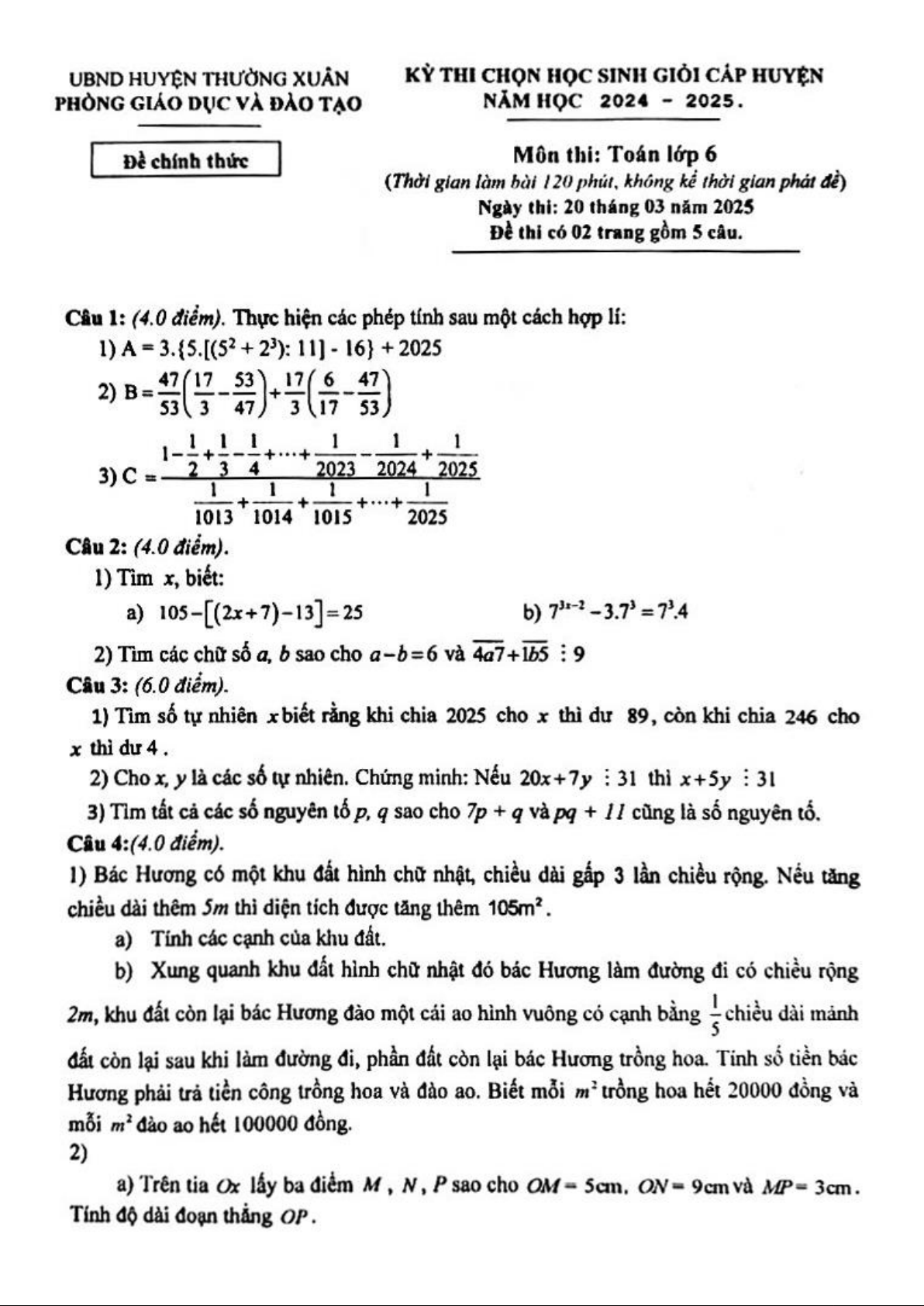 Giới thiệu đến quý thầy, cô giáo và các em học sinh lớp 6 đề thi chọn học sinh giỏi cấp huyện môn Toán 6 năm học 2024 – 2025 phòng Giáo dục và Đào tạo UBND huyện Thường Xuân, tỉnh Thanh Hóa. Kỳ thi được diễn ra vào ngày 20 tháng 03 năm 2025.