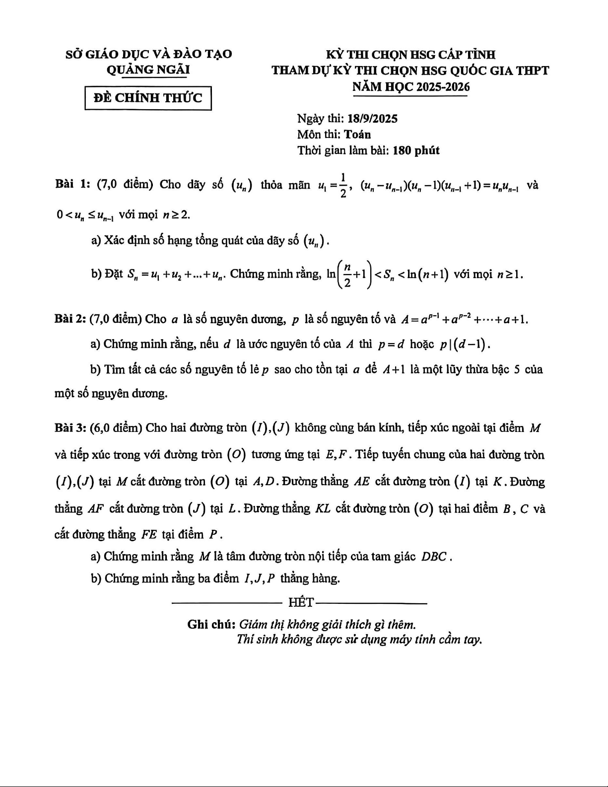 Giới thiệu đến quý thầy, cô giáo và các em học sinh đề thi chọn học sinh giỏi cấp tỉnh tham dự kỳ thi chọn học sinh giỏi Quốc gia môn Toán THPT năm học 2025 – 2026 sở Giáo dục và Đào tạo tỉnh Quảng Ngãi. Kỳ thi được diễn ra vào ngày 18 và ngày 19 tháng 09 năm 2025.