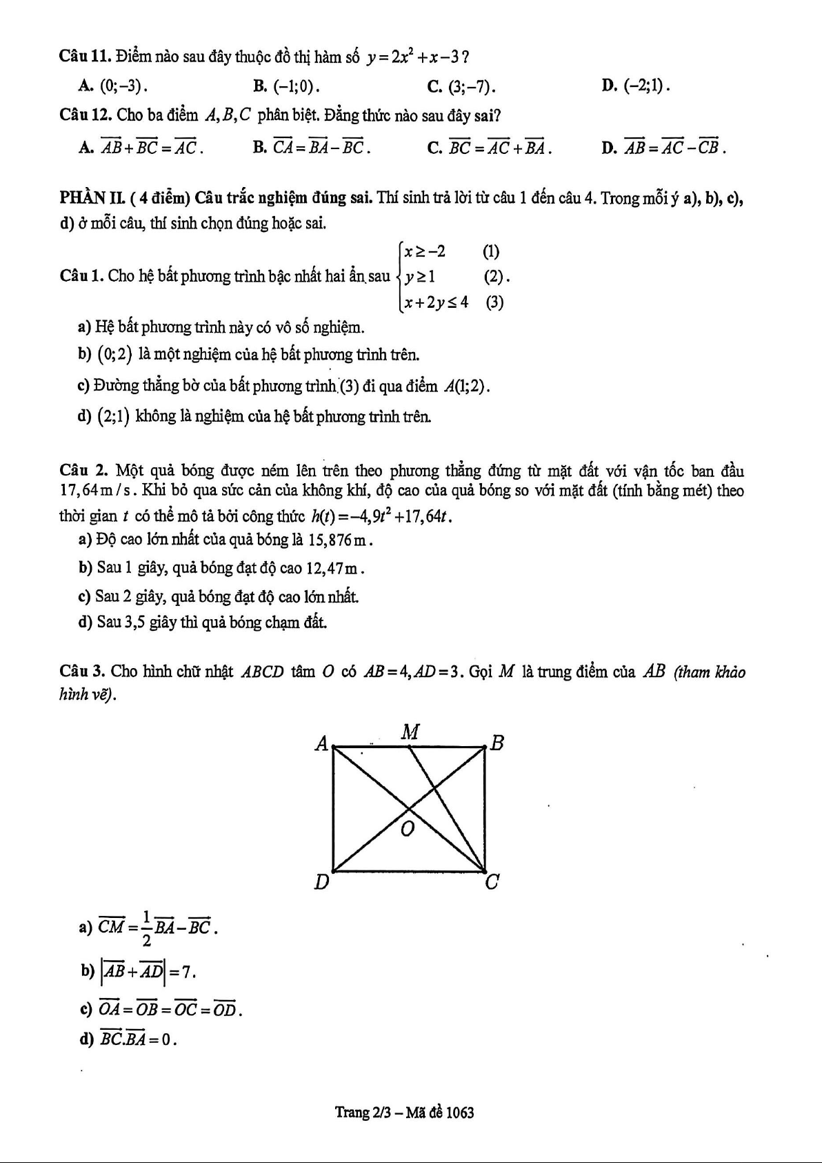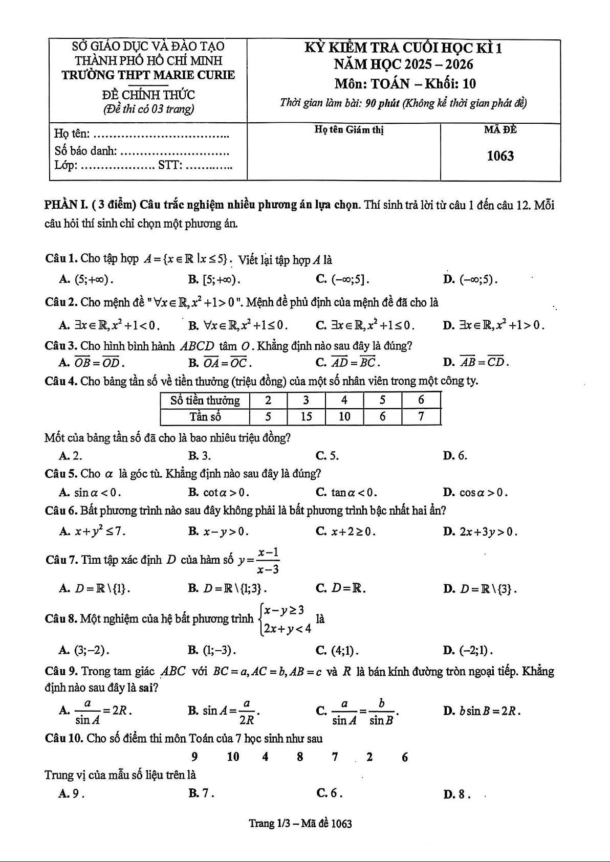 Xin giới thiệu đến quý thầy, cô giáo và các em học sinh đề kiểm tra cuối học kì 1 môn Toán 10 năm học 2025 – 2026 trường THPT Marie Curie, thành phố Hồ Chí Minh. Đề thi gồm 12 câu trắc nghiệm nhiều phương án lựa chọn (3,0 điểm) + 04 câu trắc nghiệm đúng sai (4,0 điểm) + 06 câu trắc nghiệm trả lời ngắn (3,0 điểm), thời gian làm bài 90 phút, có đáp án mã đề 1061 – 1062 – 1063 – 1064. Kỳ thi được diễn ra vào ngày 17 tháng 12 năm 2025.