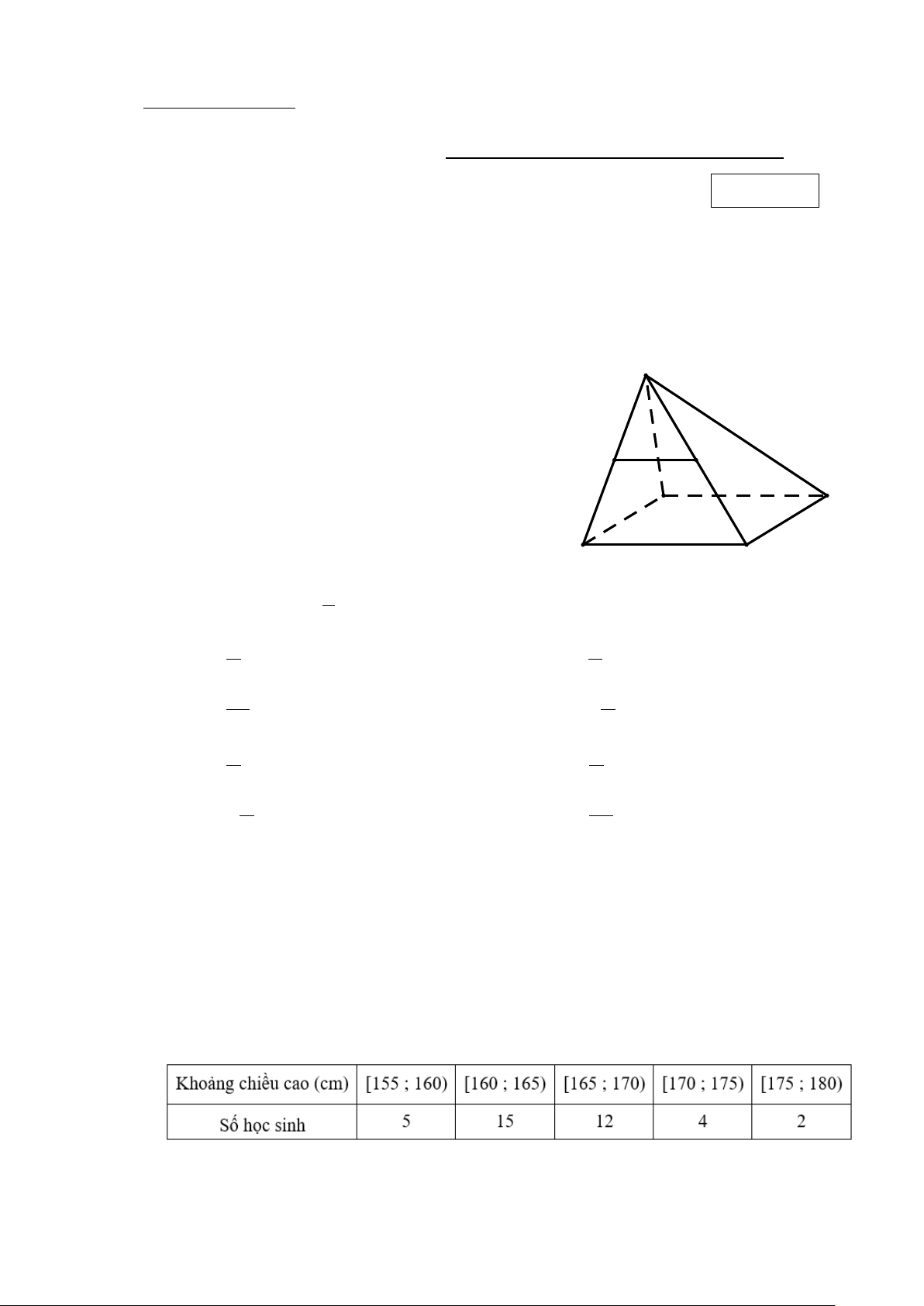 Câu 5: Khảo sát chiều cao của 38 học sinh lớp 11B thu được mẫu số liệu ghép nhóm sau: Nhóm chứa trung vị là A. [165;170) . B. [160;165) . C. [155;160) . D. [170;175) . Trang 1 – Mã đề 111