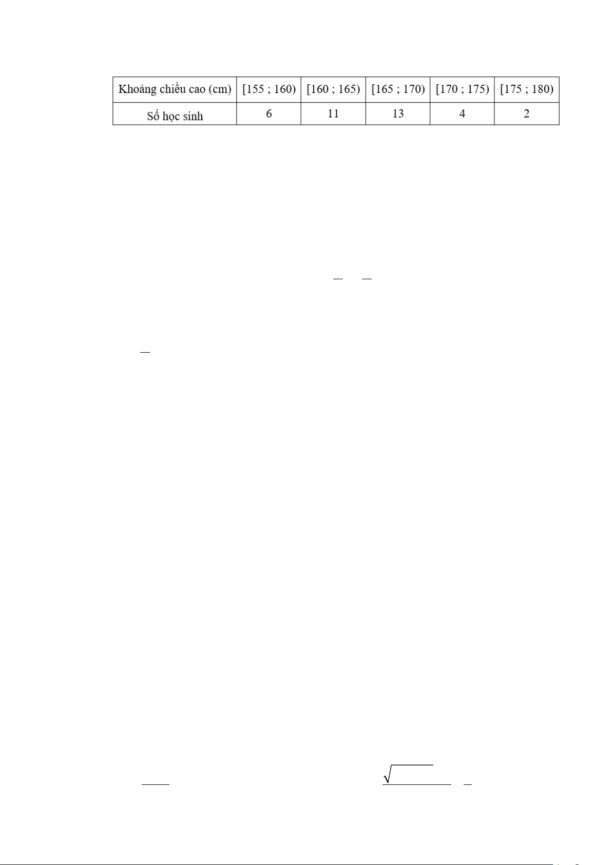 Câu 12: Khảo sát chiều cao của 36 học sinh lớp 11B thu được mẫu số liệu ghép nhóm sau: Nhóm chứa trung vị là A. [155;160) . B. [170;175) . C. [160;165) . D. [165;170) .