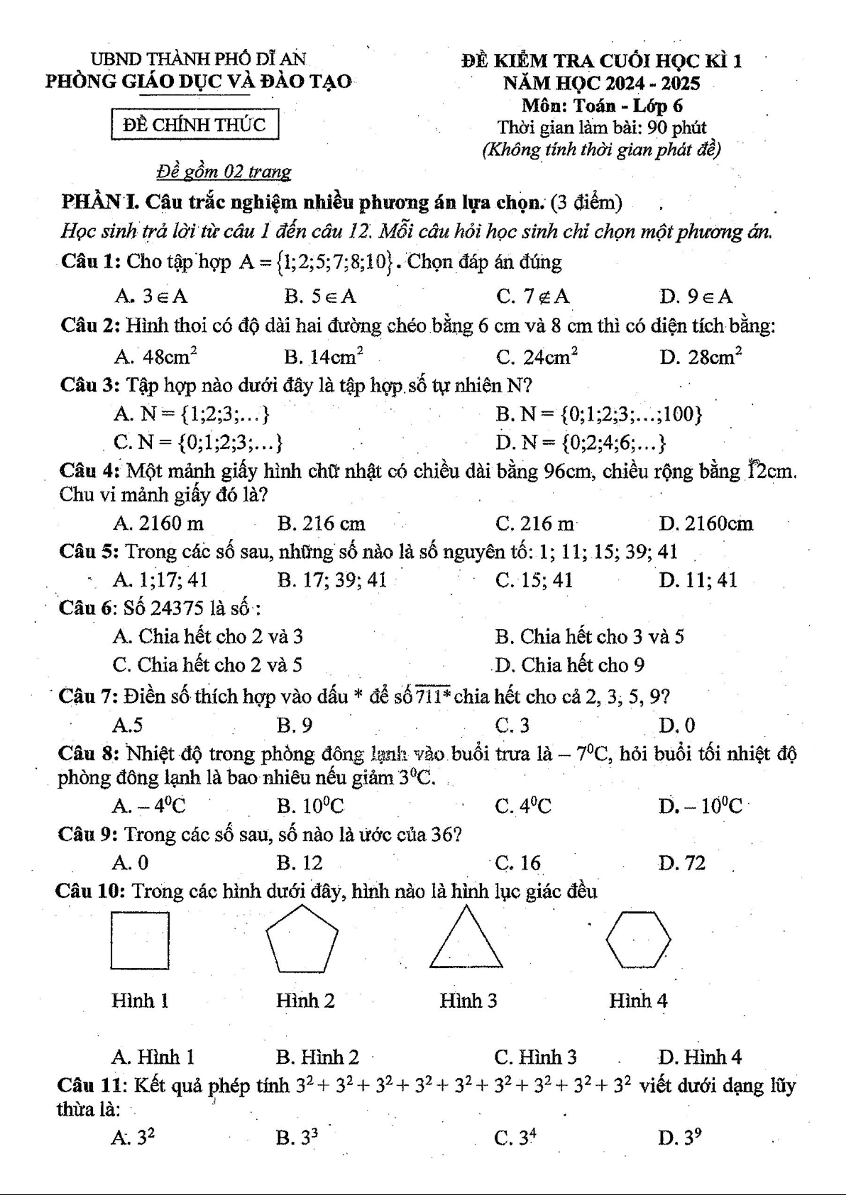 Đề cuối học kì 1 Toán 6 năm 2024 – 2025 phòng GD&ĐT Dĩ An – Bình Dương