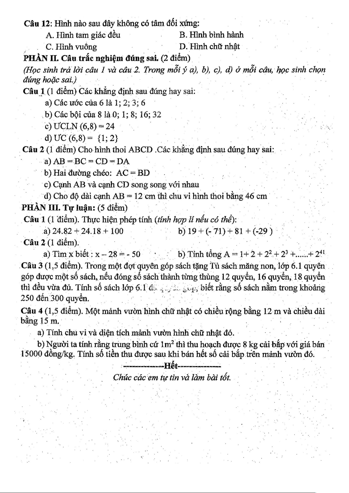 Giới thiệu đến quý thầy, cô giáo và các em học sinh lớp 6 đề kiểm tra cuối học kì 1 môn Toán 6 năm học 2024 – 2025 phòng Giáo dục và Đào tạo UBND thành phố Dĩ An, tỉnh Bình Dương. Đề thi cấu trúc 30% trắc nghiệm nhiều phương án lựa chọn + 20% trắc nghiệm đúng sai + 50% tự luận, thời gian làm bài 90 phút.