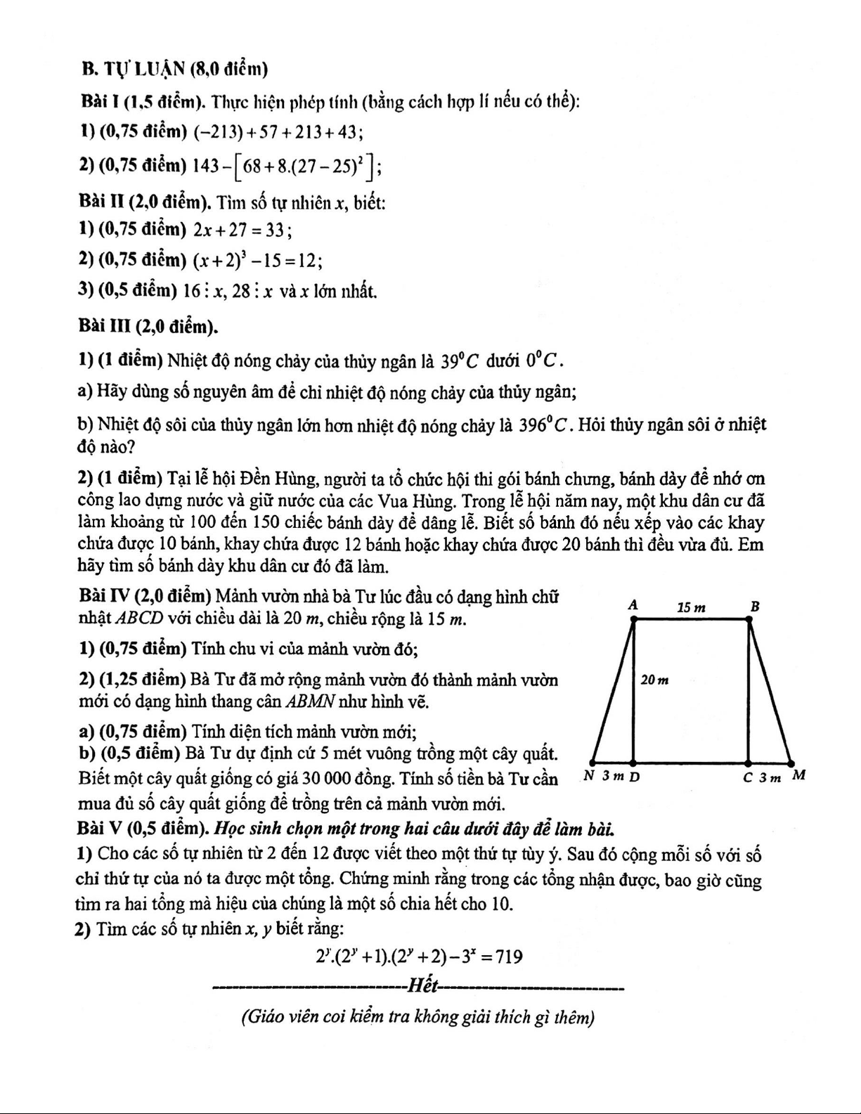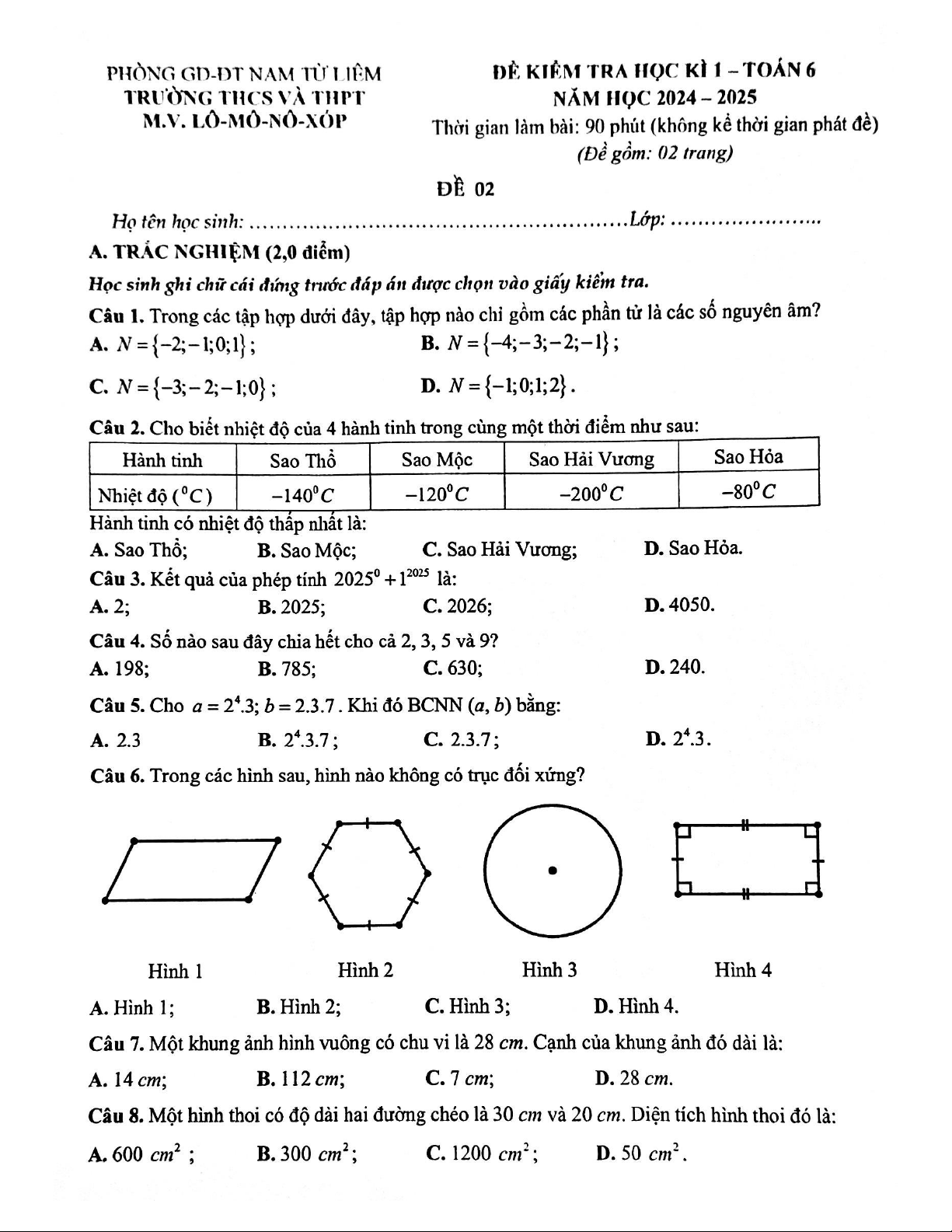 Đề cuối học kì 1 Toán 6 năm 2024 – 2025 trường M.V. Lômônôxốp – Hà Nội