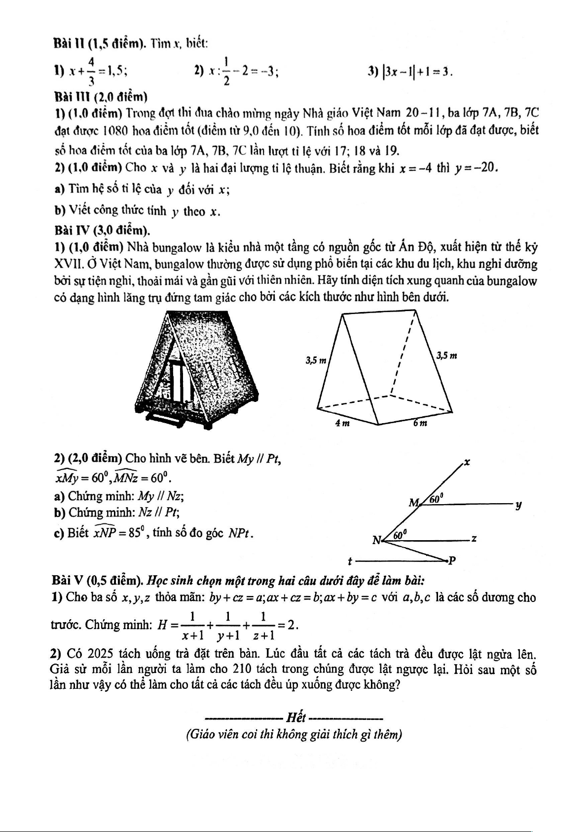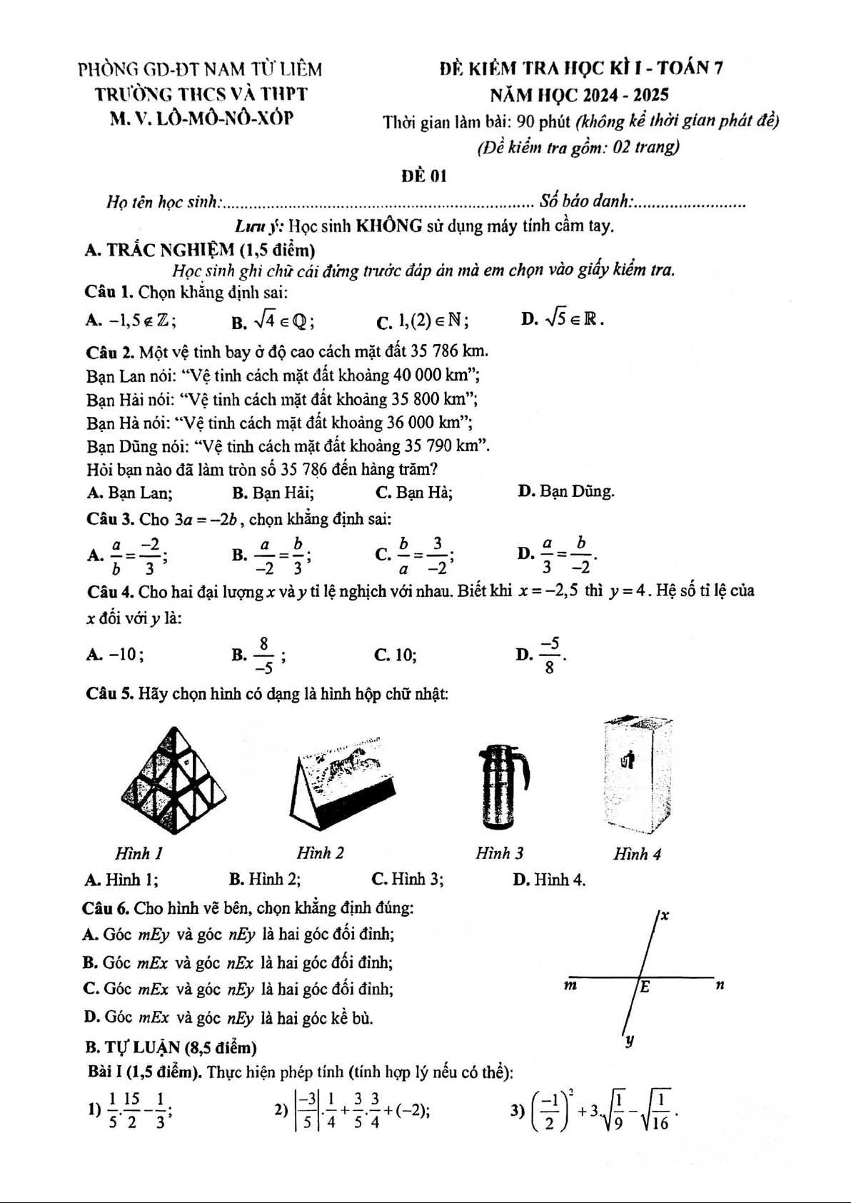 Đề cuối học kì 1 Toán 7 năm 2024 – 2025 trường M.V. Lômônôxốp – Hà Nội
