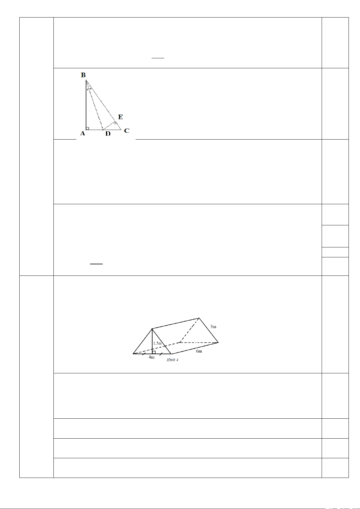 b) Diện tích xung quanh hình lăng trụ đứng tam giác 0,5 Sxq = (3+3+4).6 = 60m2 Diện tích toàn phần: 0,25 60 + 4.1,5 = 66m2