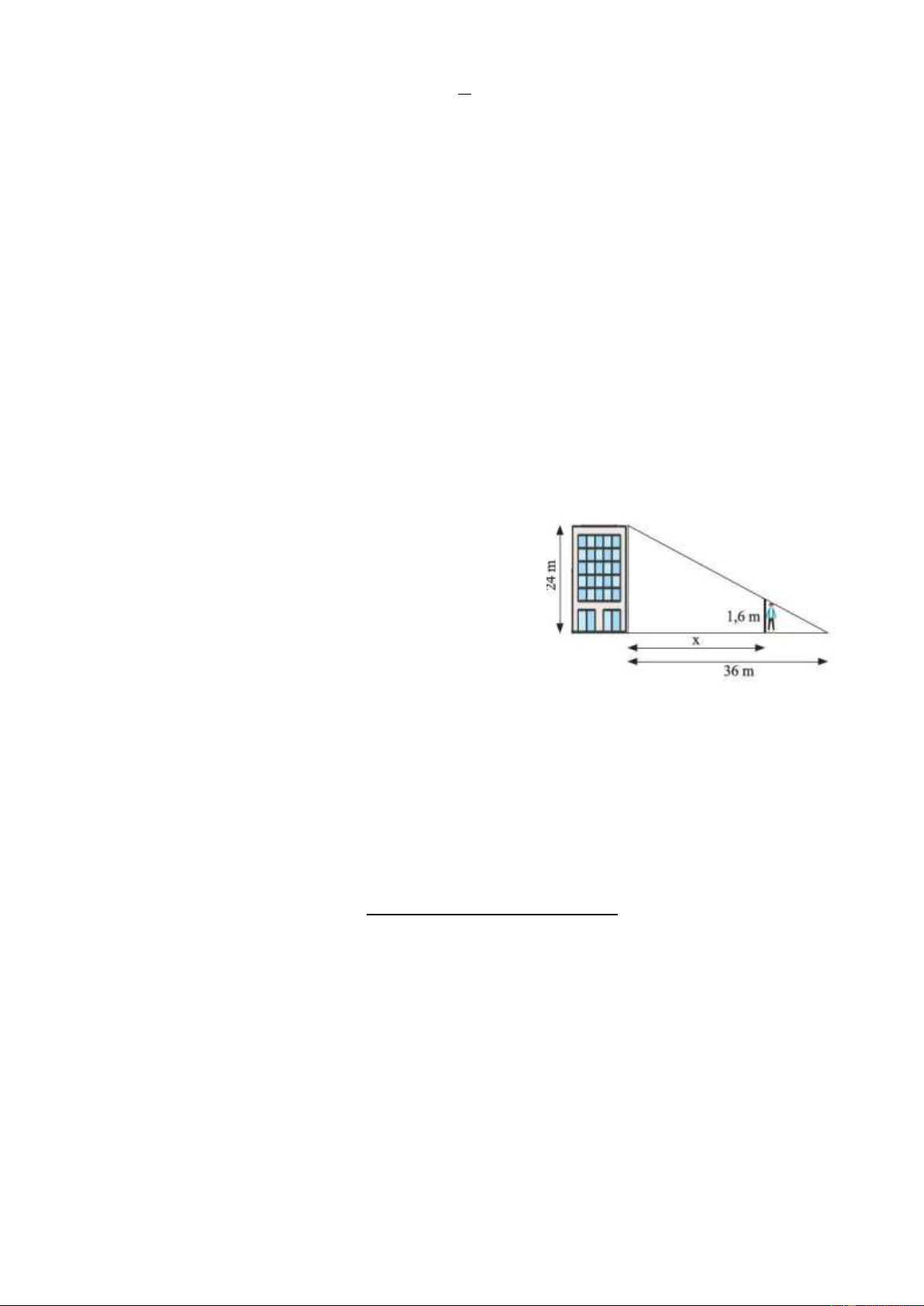 nhà. Hỏi người đó có thể đứng cách tòa nhà xa nhất bao nhiêu mét?  Ta có DE // AB nên theo  hệ quả thales ta có    DE CE      suy  ra    AB CA 0,25  1,6.36   CE   2, 4m   24    x = 36 -2,4 = 33,6 m  0,25
