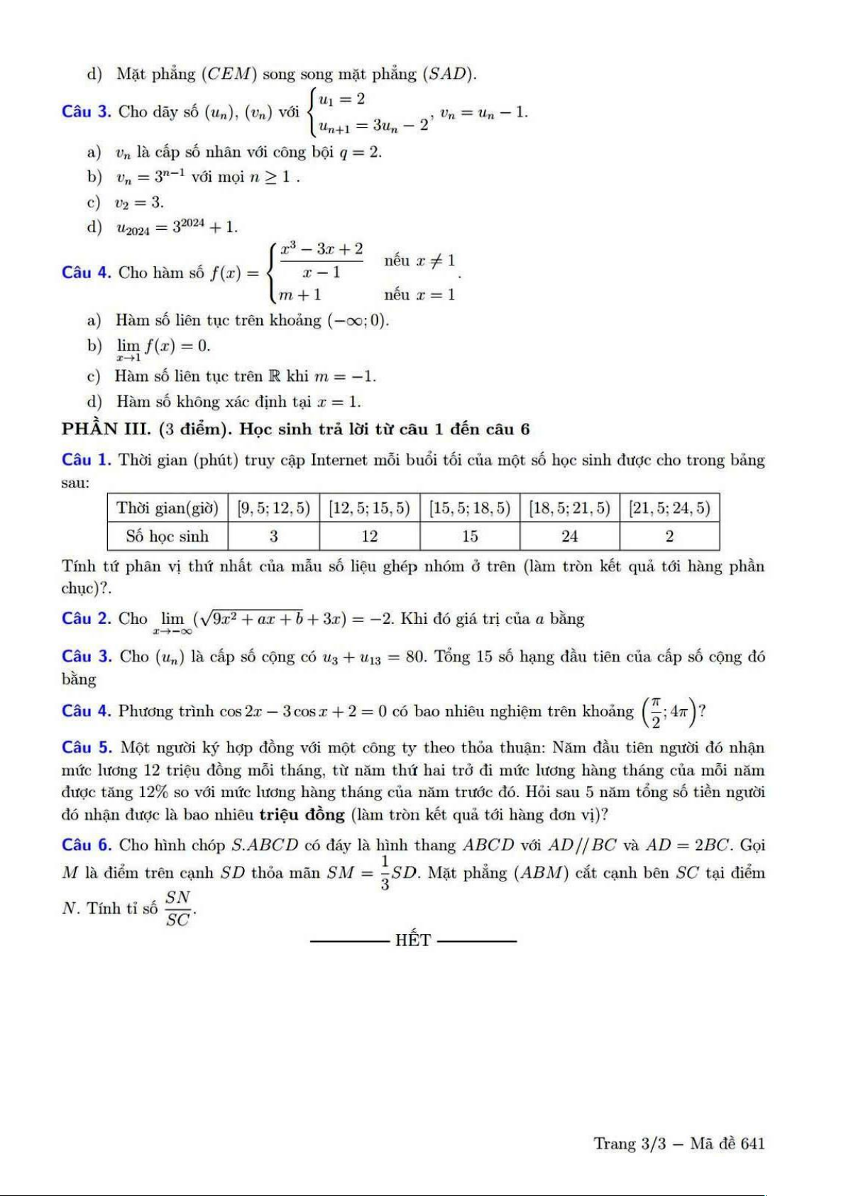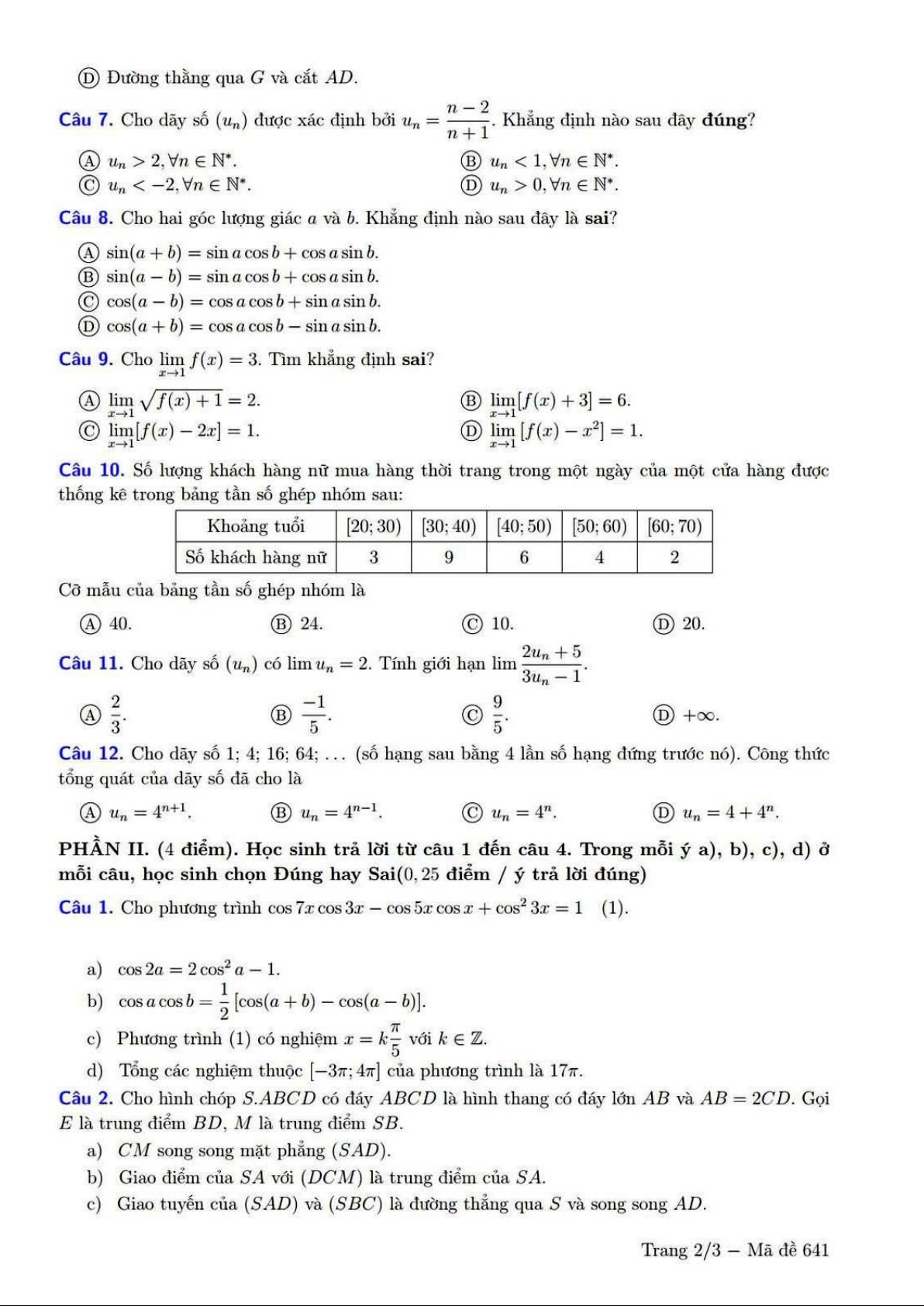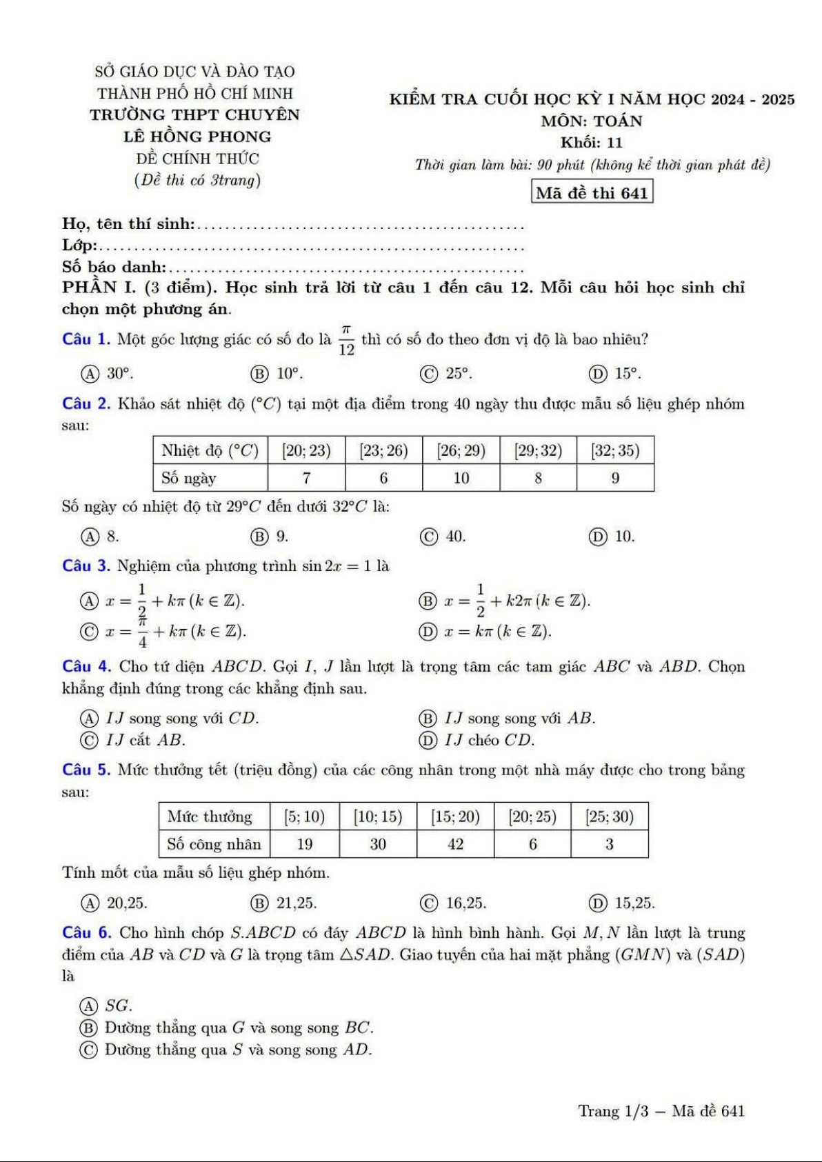 Giới thiệu đến quý thầy, cô giáo và các em học sinh lớp 11 đề kiểm tra cuối học kỳ 1 môn Toán 11 năm học 2024 – 2025 trường THPT chuyên Lê Hồng Phong, thành phố Hồ Chí Minh. Đề thi gồm 12 câu trắc nghiệm nhiều phương án lựa chọn + 04 câu trắc nghiệm đúng sai + 06 câu trắc nghiệm trả lời ngắn, thời gian làm bài 90 phút. Đề thi có đáp án mã đề 641 – 811 – 721 – 331.