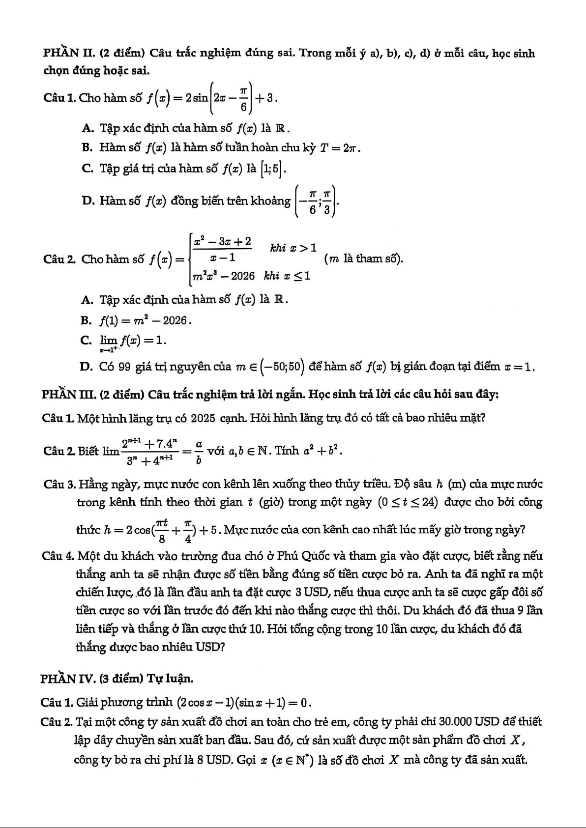 Xin giới thiệu đến quý thầy, cô giáo và các em học sinh đề kiểm tra cuối học kỳ 1 môn Toán 11 năm học 2025 – 2026 trường THPT Mạc Đĩnh Chi, thành phố Hồ Chí Minh. Đề thi gồm 12 câu trắc nghiệm nhiều phương án lựa chọn (3,0 điểm) + 02 câu trắc nghiệm đúng sai (2,0 điểm) + 04 câu trắc nghiệm trả lời ngắn (2,0 điểm) + 03 câu tự luận (3,0 điểm), thời gian làm bài 90 phút.