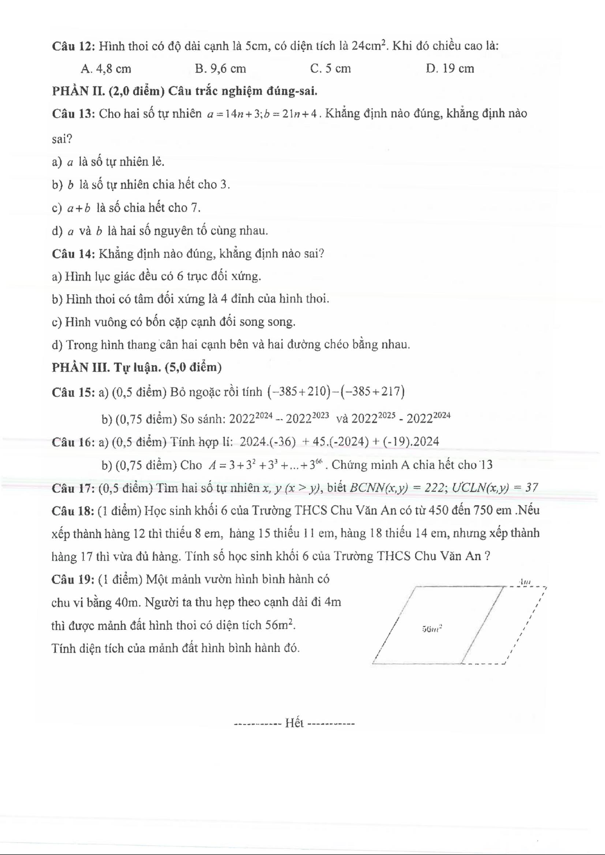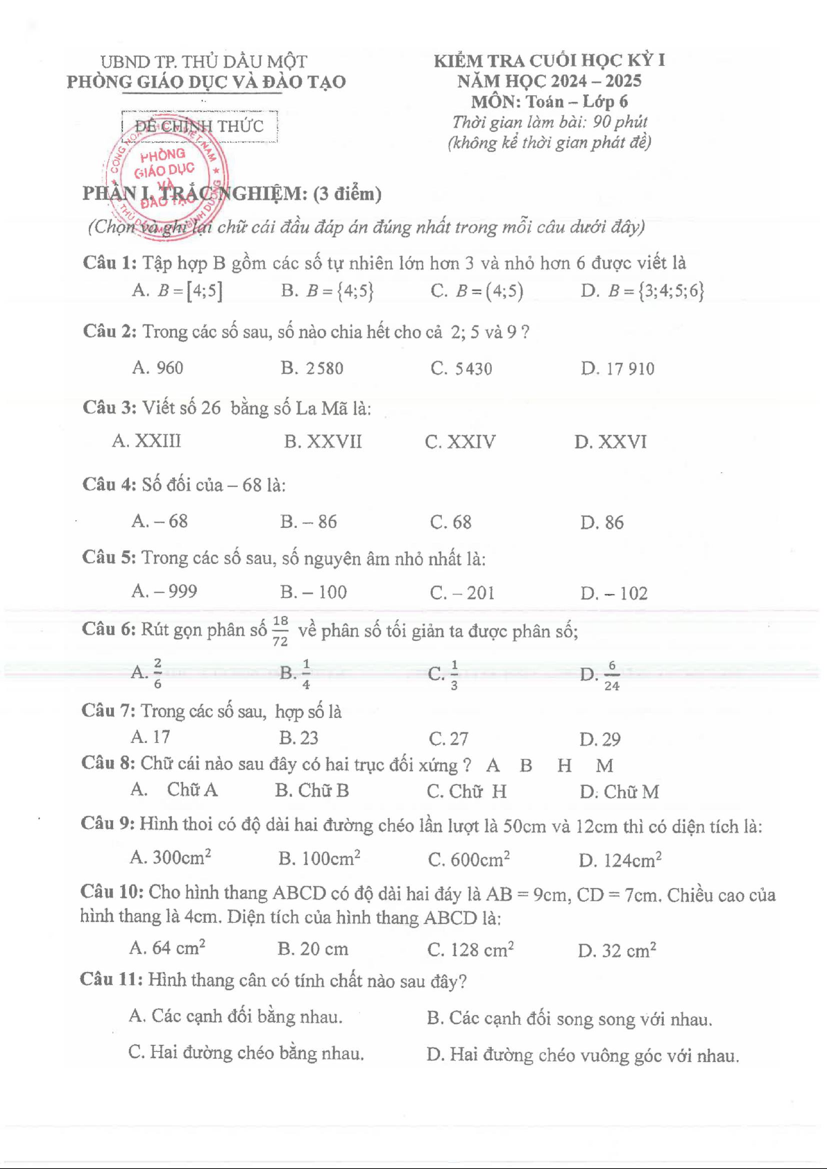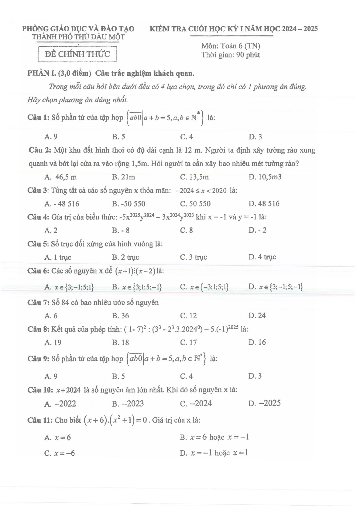 Đề cuối học kỳ 1 Toán 6 năm 2024 – 2025 phòng GD&ĐT Thủ Dầu Một – Bình Dương