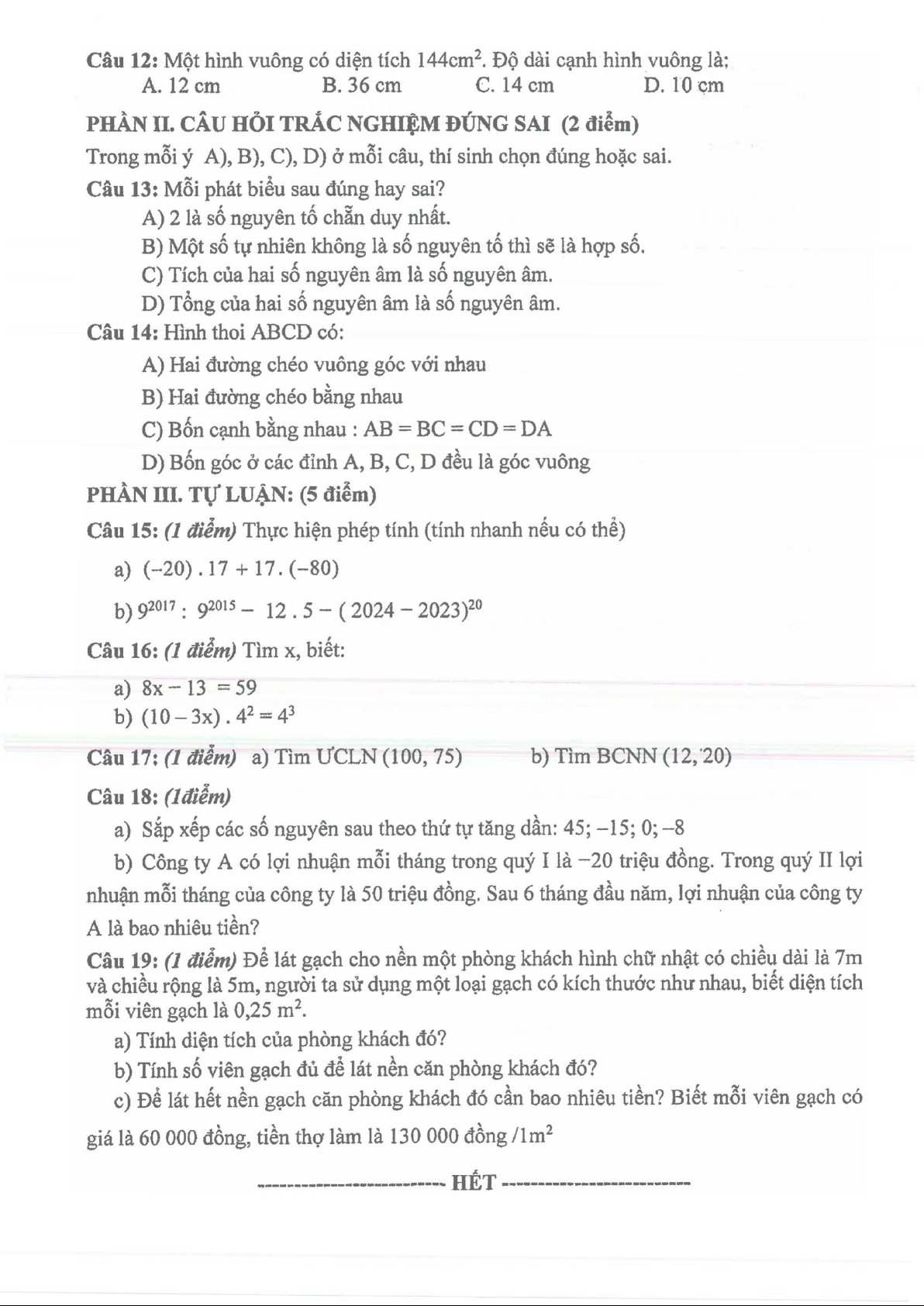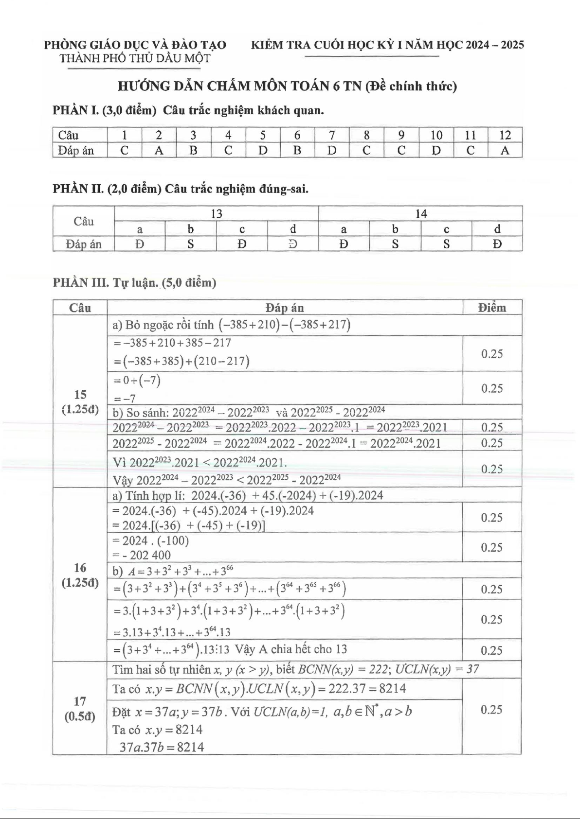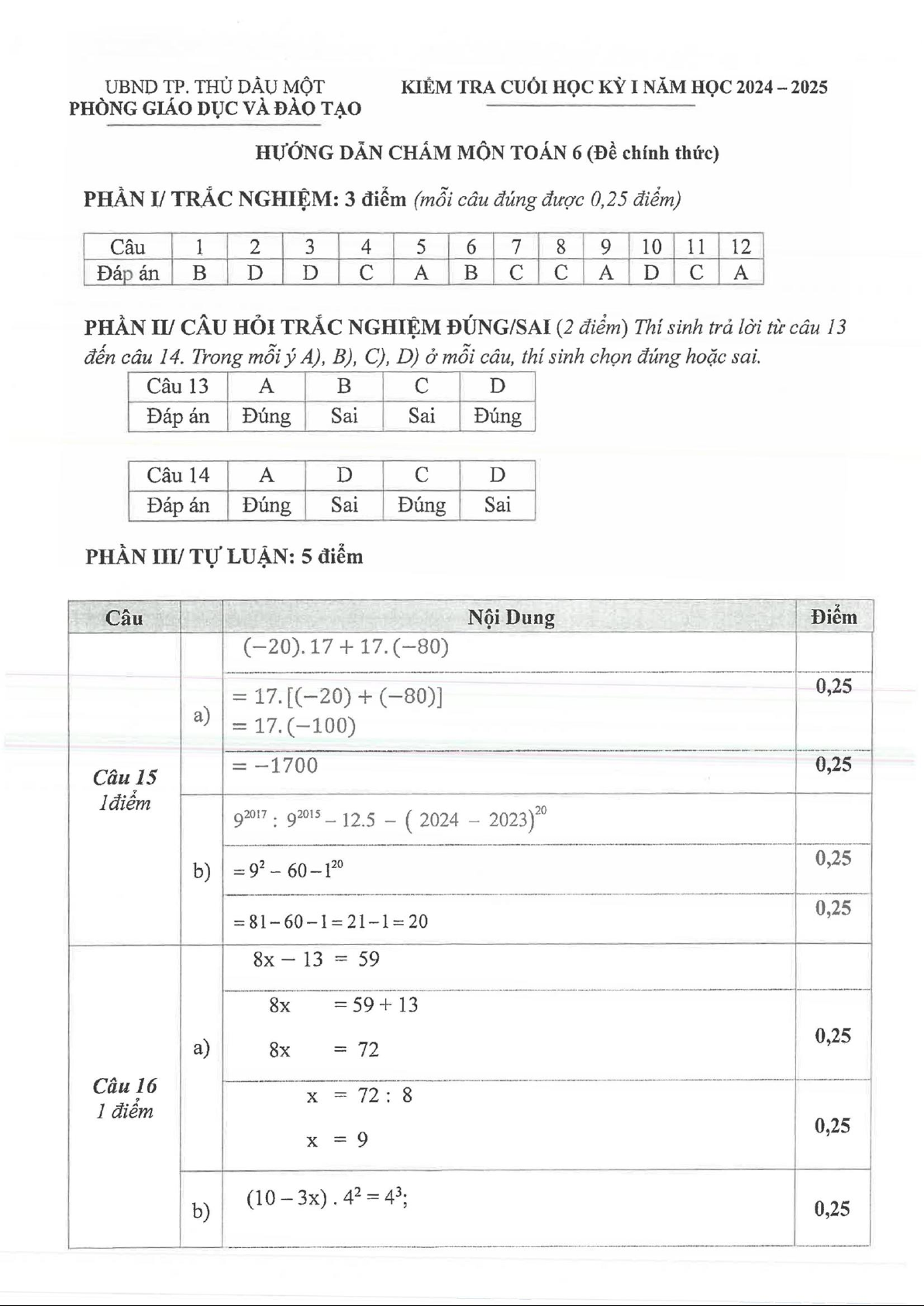 Giới thiệu đến quý thầy, cô giáo và các em học sinh lớp 6 đề kiểm tra cuối học kỳ 1 môn Toán 6 năm học 2024 – 2025 phòng Giáo dục và Đào tạo thành phố Thủ Dầu Một, tỉnh Bình Dương. Đề thi cấu trúc 30% trắc nghiệm nhiều phương án lựa chọn (12 câu) + 20% trắc nghiệm đúng sai (02 câu) + 50% tự luận (05 câu), thời gian làm bài 90 phút. Đề thi có đáp án chi tiết và hướng dẫn chấm điểm.