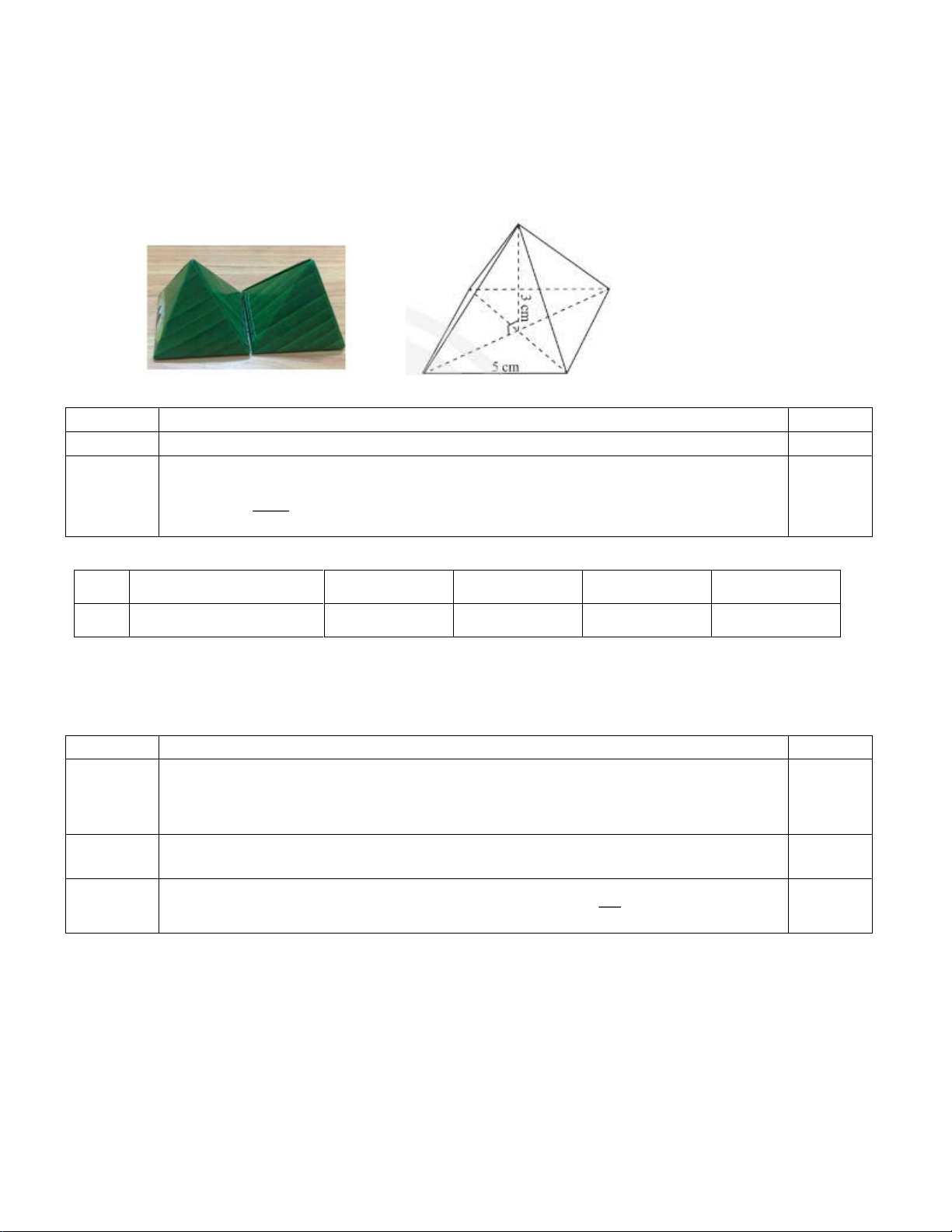 a) (0,5đ) Hình này gồm 4 mặt bên, các mặt bên là các tam giác cân. 0,25x2 Diện tích đáy: 2 5 = 25 (cm2) b) (1,0đ) 25.3 0,5x2 Thể tích: = 25 (cm3) 3