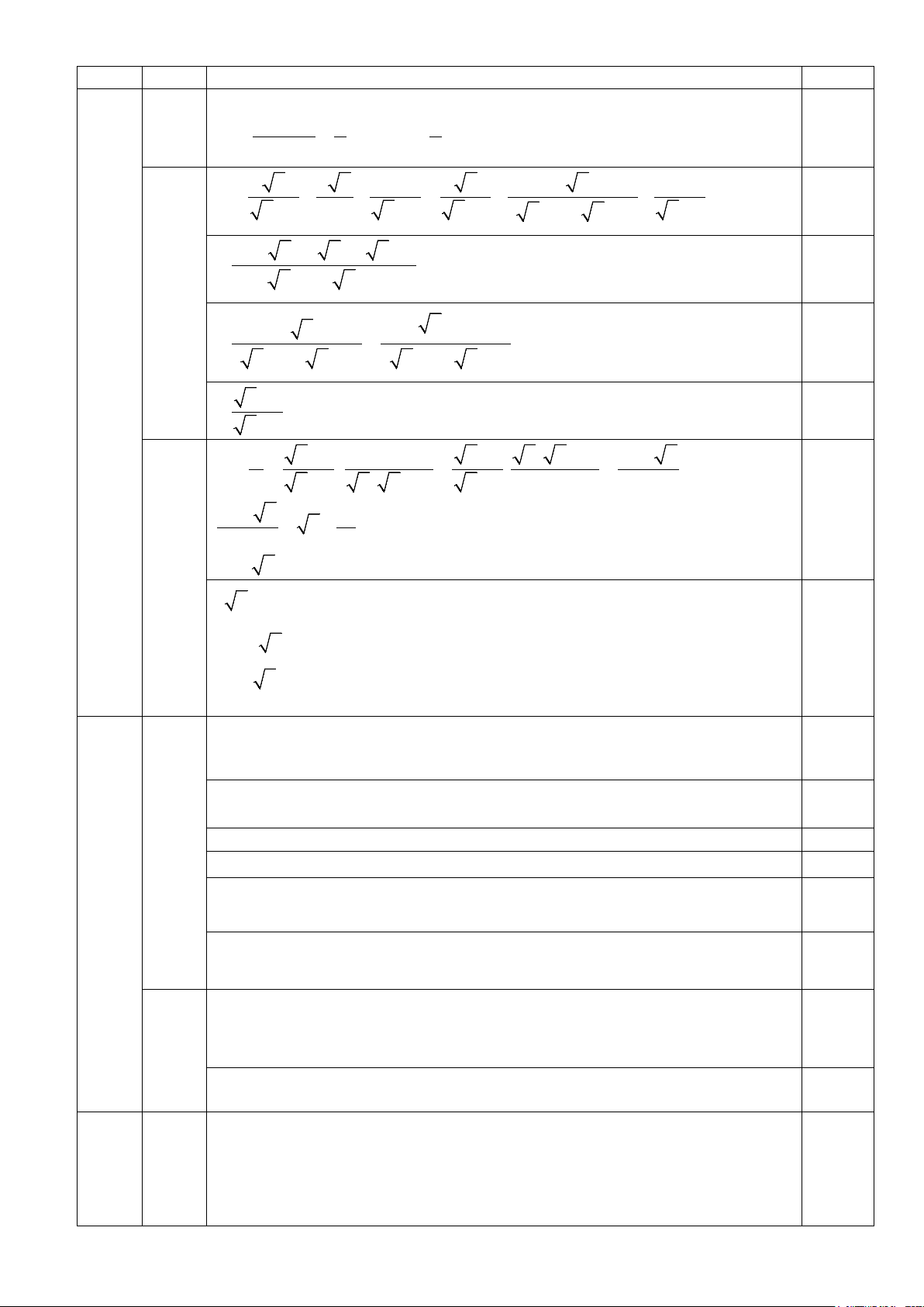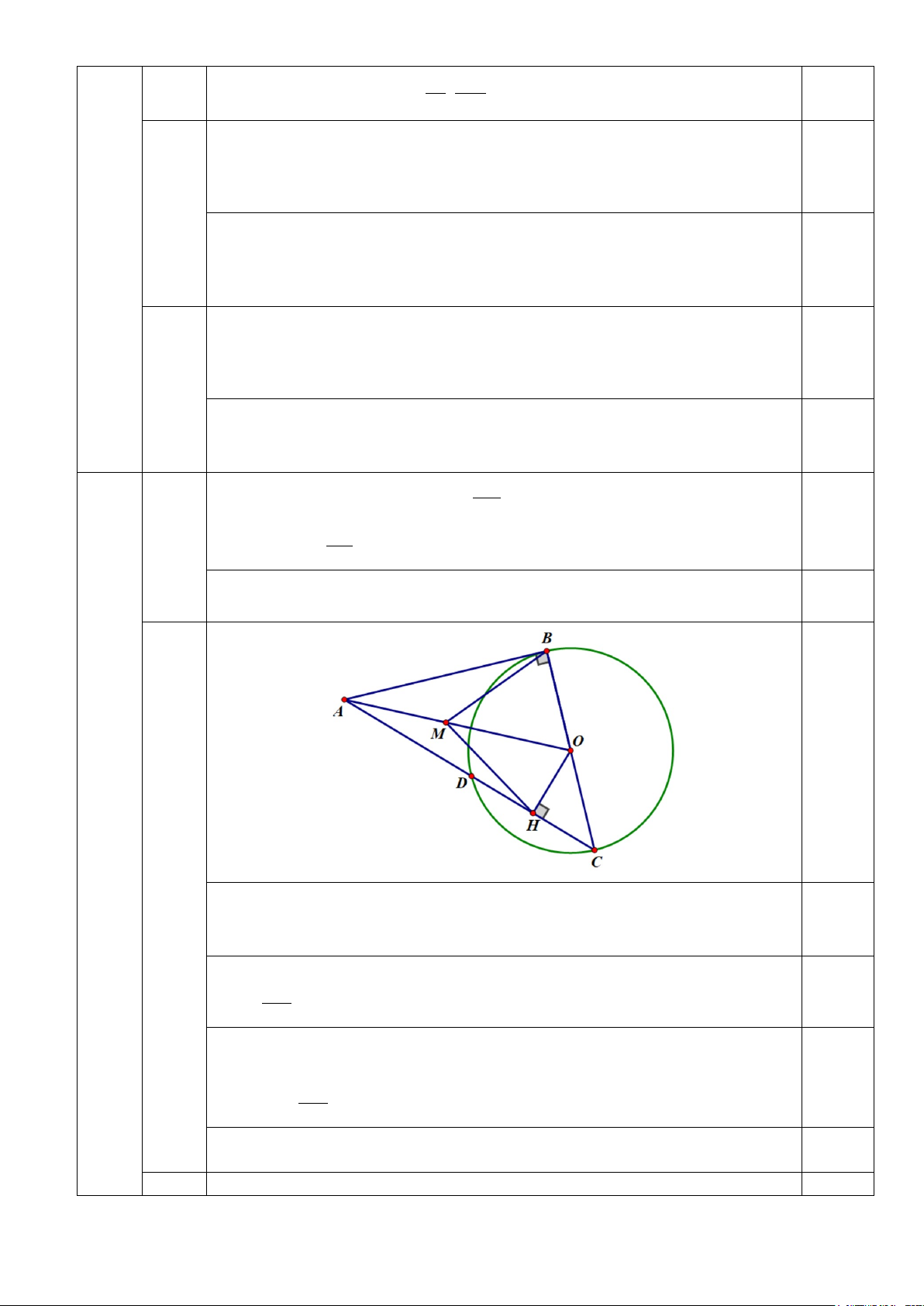 đường tròn tâm M, đường kính AO (đpcm). 0,25 Xét OHC ∆ và AB ∆ C có: 0,5 = OHC ABC = 90° IV.2b ACB chung (1,0 Suy ra OHC ∆ và AB ∆ C đồng dạng (g.g) điểm) Suy ra CH OC = BC CA 0,5 2 CH.CA = BC.OC = 2R (đpcm). 0,25 Ta có OC = OD = R IV.2c Suy ra OC ∆
