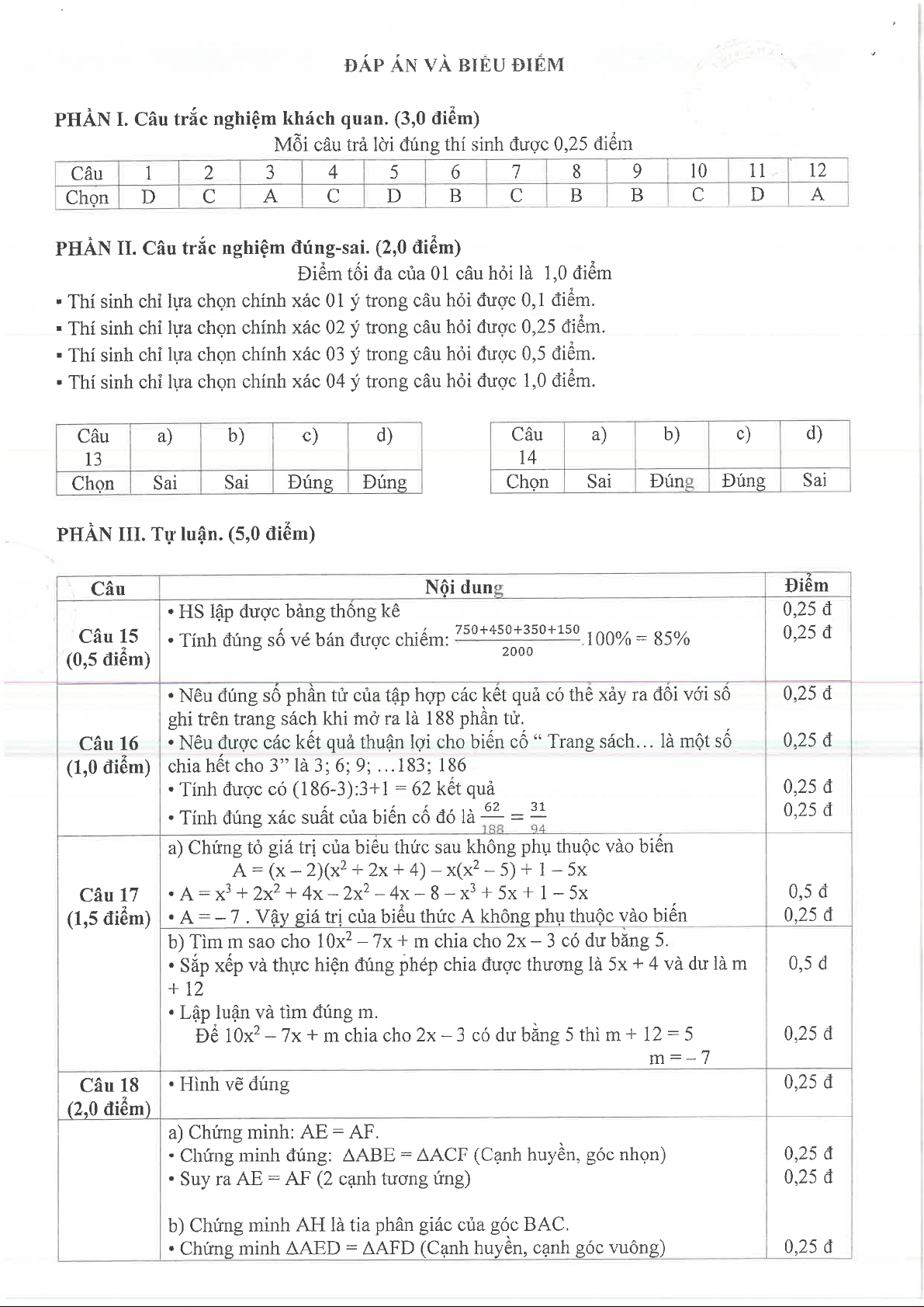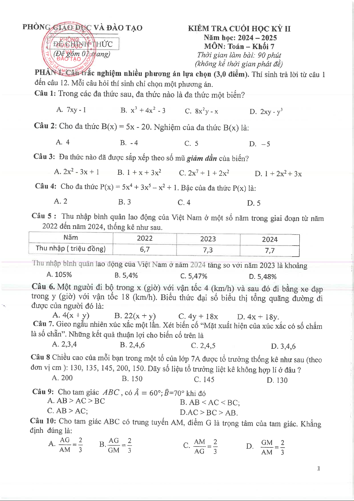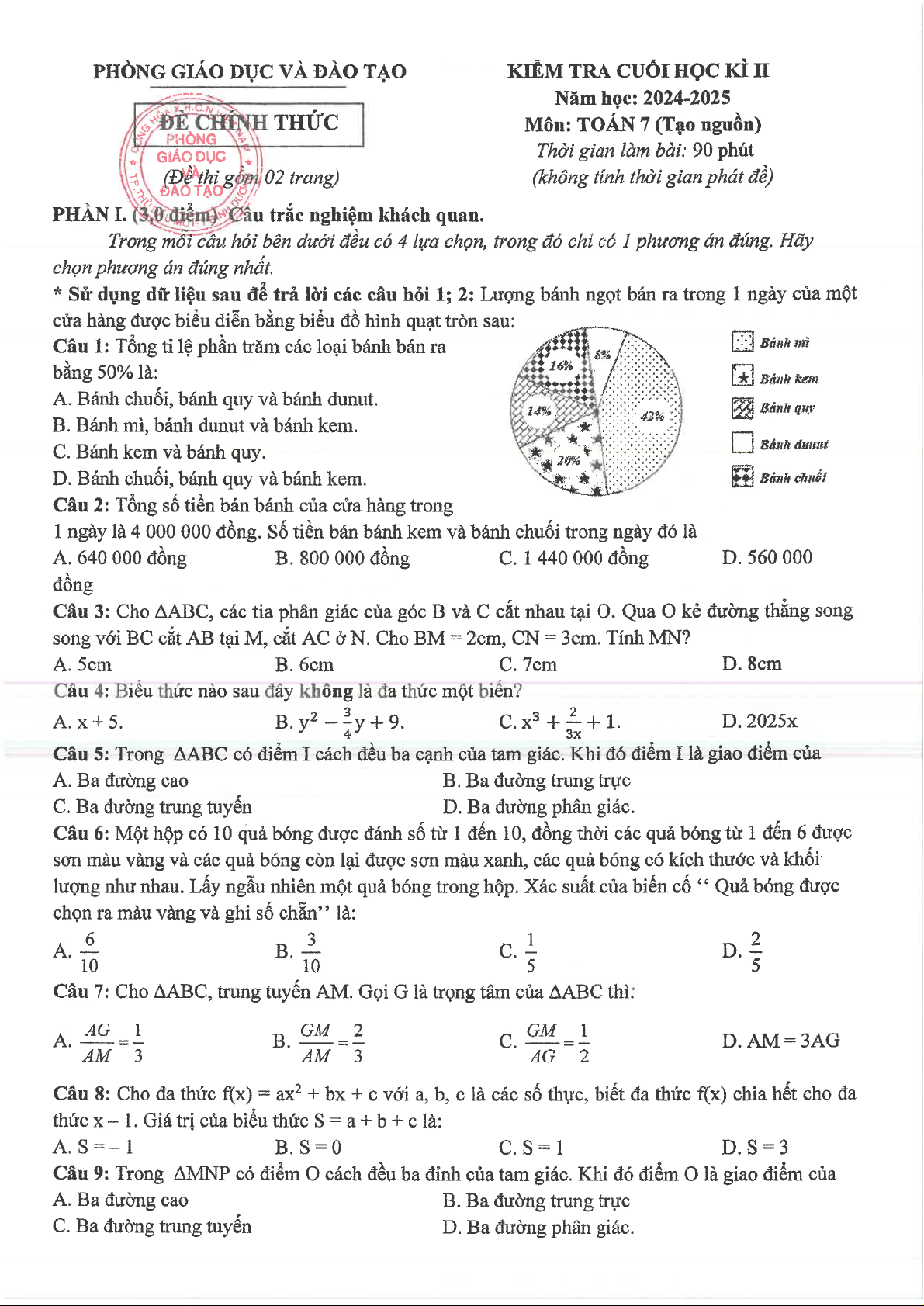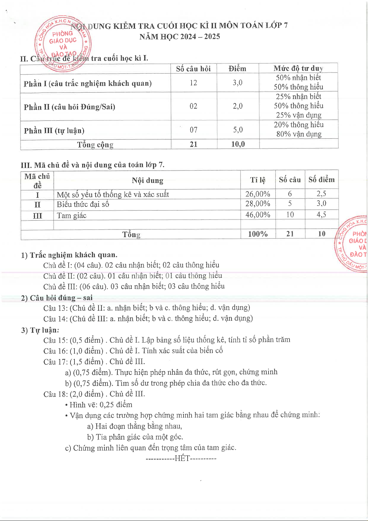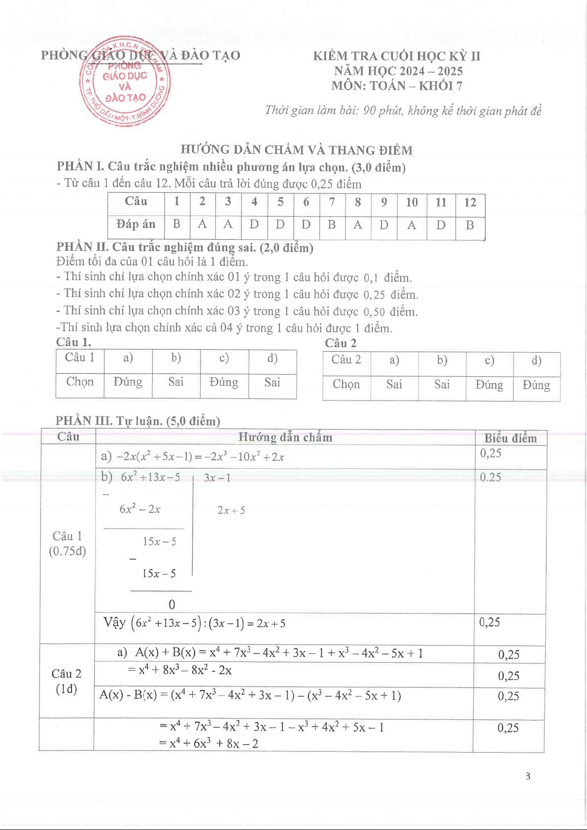 Giới thiệu đến quý thầy, cô giáo và các em học sinh lớp 7 đề kiểm tra cuối học kỳ 2 môn Toán 7 năm học 2024 – 2025 phòng Giáo dục và Đào tạo thành phố Thủ Dầu Một, tỉnh Bình Dương. Đề thi cấu trúc 30% trắc nghiệm nhiều phương án lựa chọn (12 câu) + 20% trắc nghiệm đúng sai (02 câu) + 50% tự luận (05 câu), thời gian làm bài 90 phút, có đáp án chi tiết và hướng dẫn chấm điểm.