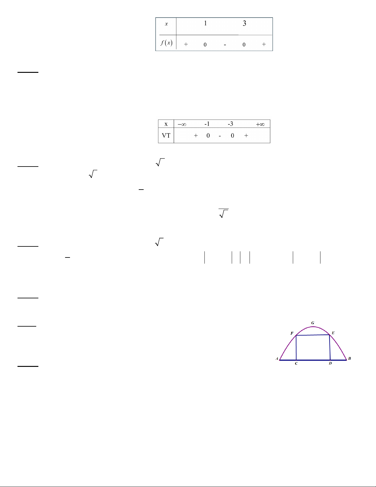 Câu 10. Cho đồ thị hàm số y = f (x) , xác định khoảng của x để f (x) ≥ 0, A. ( ; −∞ ) 1 ∪ (3;+∞) . B. ( ; −∞ ] 1 ∪[3;+∞) . C. [1; ] 3 D. (1;3).