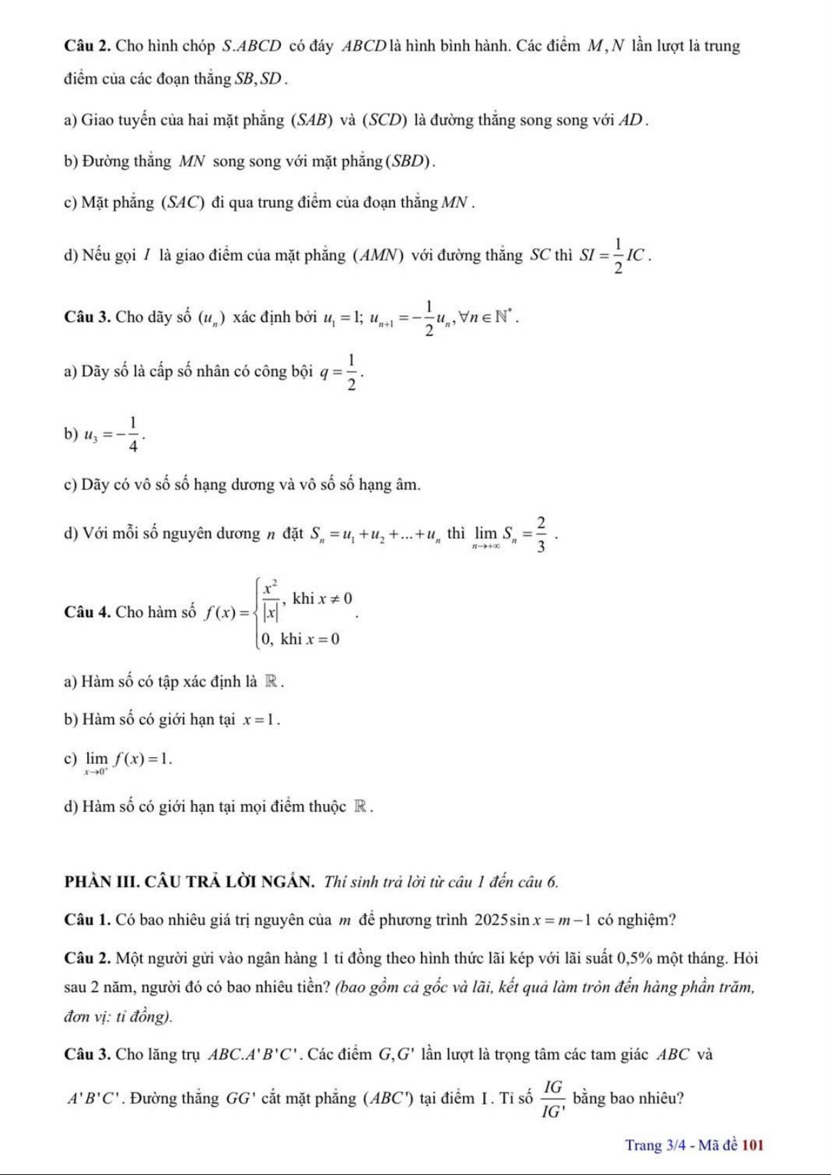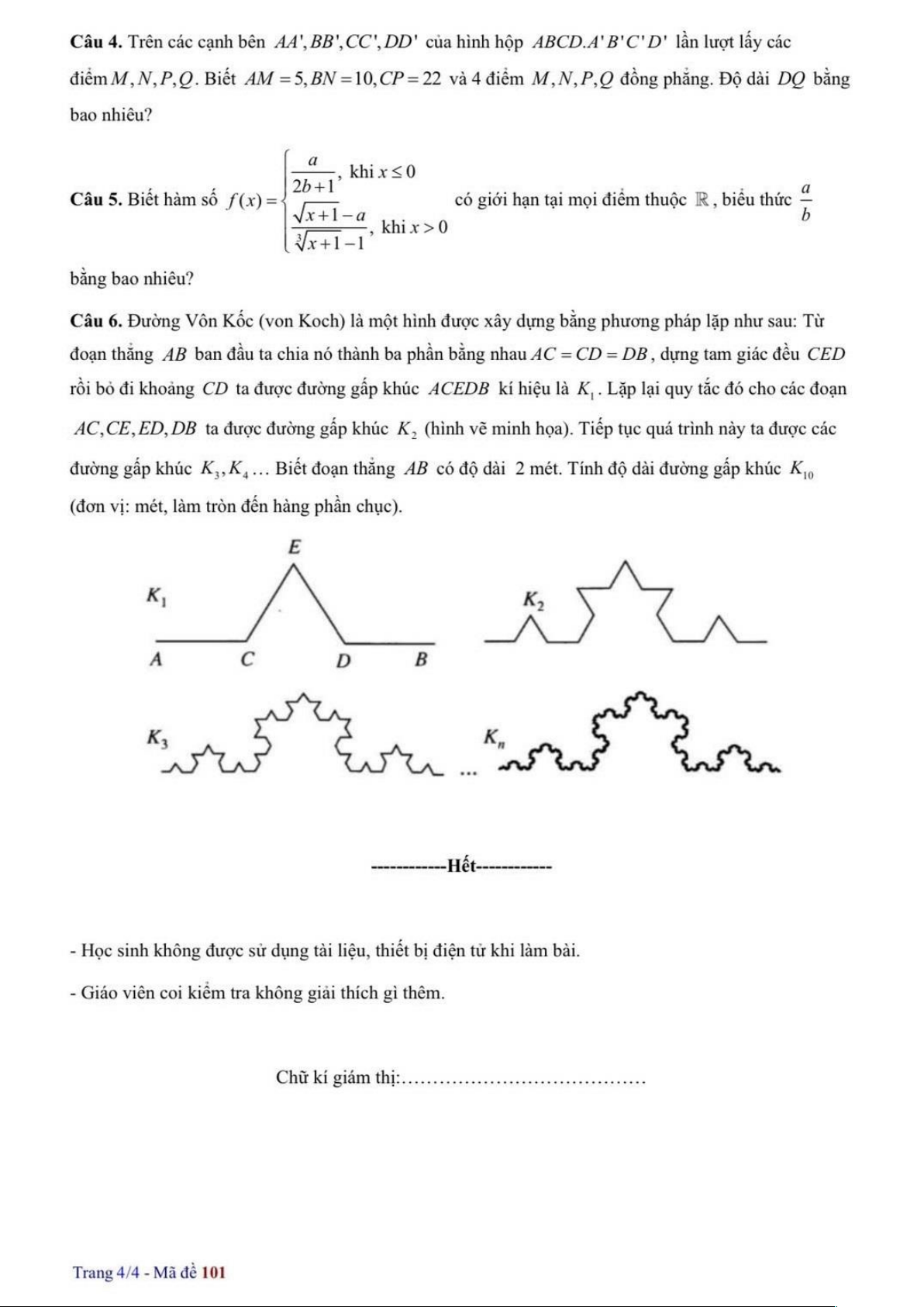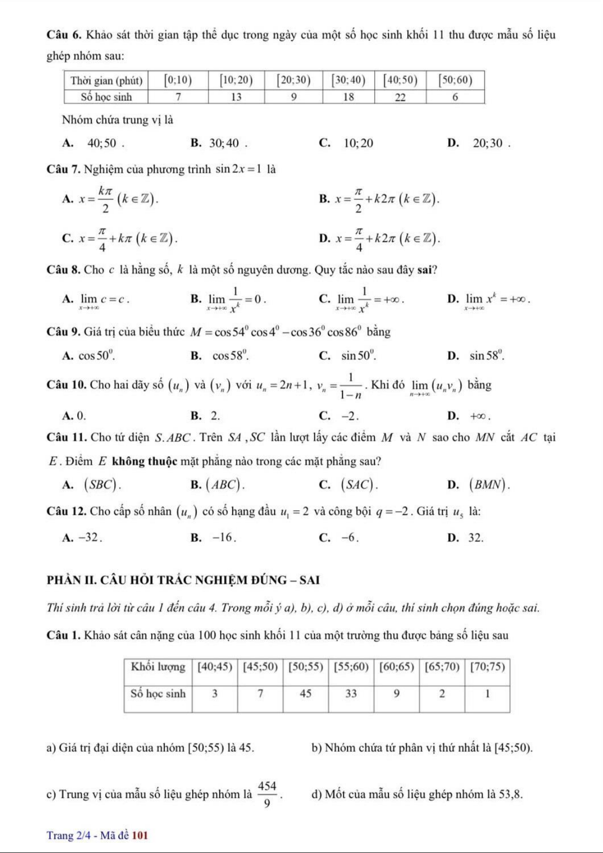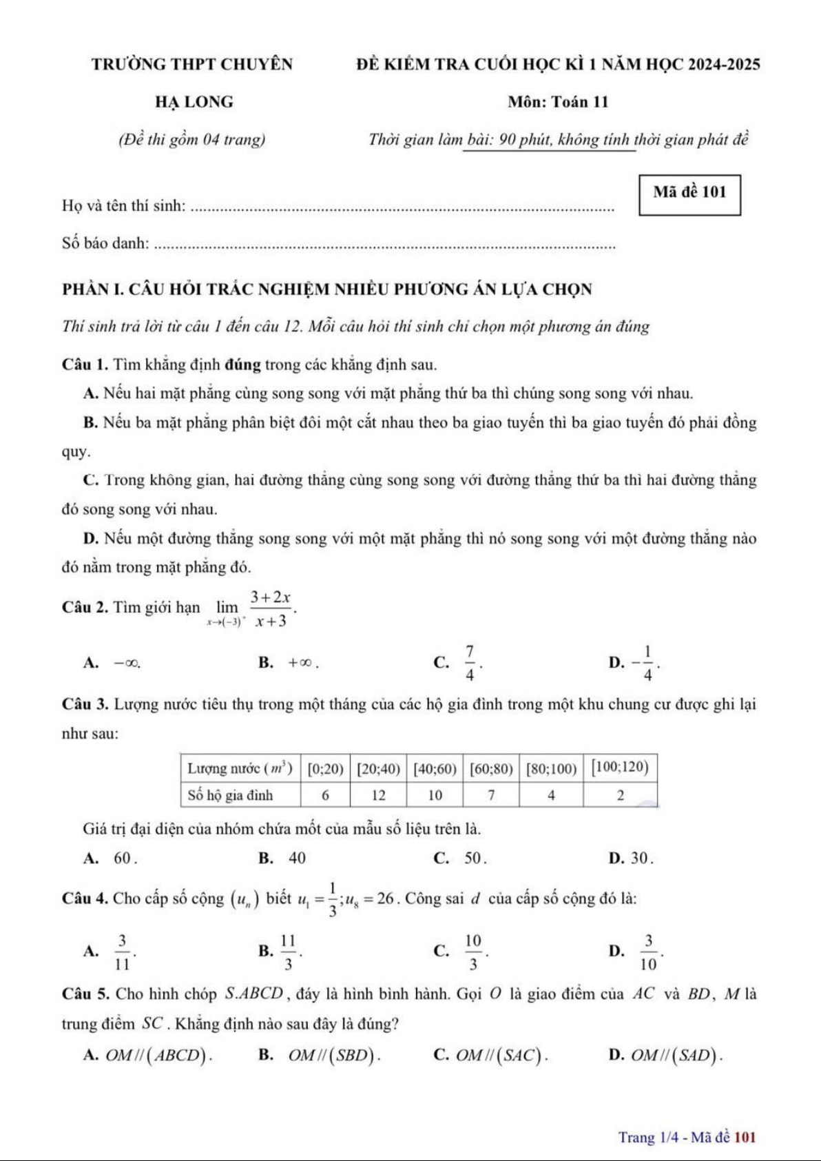 Giới thiệu đến quý thầy, cô giáo và các em học sinh lớp 11 đề kiểm tra cuối học kì 1 môn Toán 11 năm học 2024 – 2025 trường THPT chuyên Hạ Long, tỉnh Quảng Ninh. Đề thi gồm 04 trang, hình thức 30% trắc nghiệm nhiều phương án lựa chọn + 40% trắc nghiệm đúng sai + 30% trắc nghiệm trả lời ngắn, thời gian làm bài 90 phút.