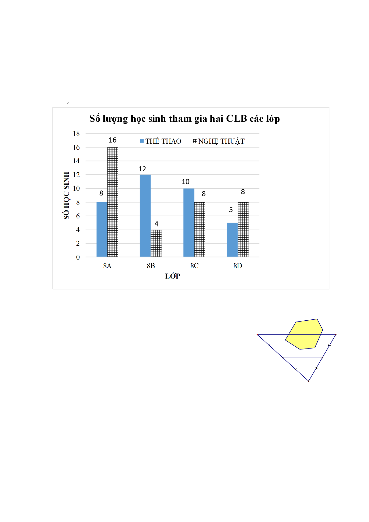 sinh lớp 8A tham gia từng CLB nghệ thuật và thể thao chiếm bao nhiêu phần trăm? 3 Bảng thống kê (1đ) a Lớp 8A 8B 8C 8D 0.5 (0.5) Thể thao 8 12 10 5 Nghệ thuật 16 4 8 8 b