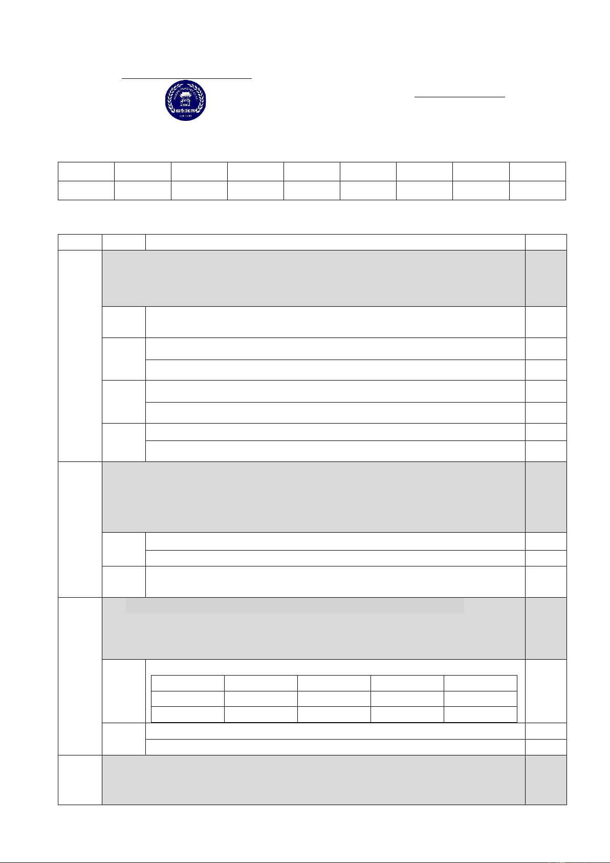 Lưu ý: Học sinh làm toàn bộ bài thi vào giấy kiểm tra
