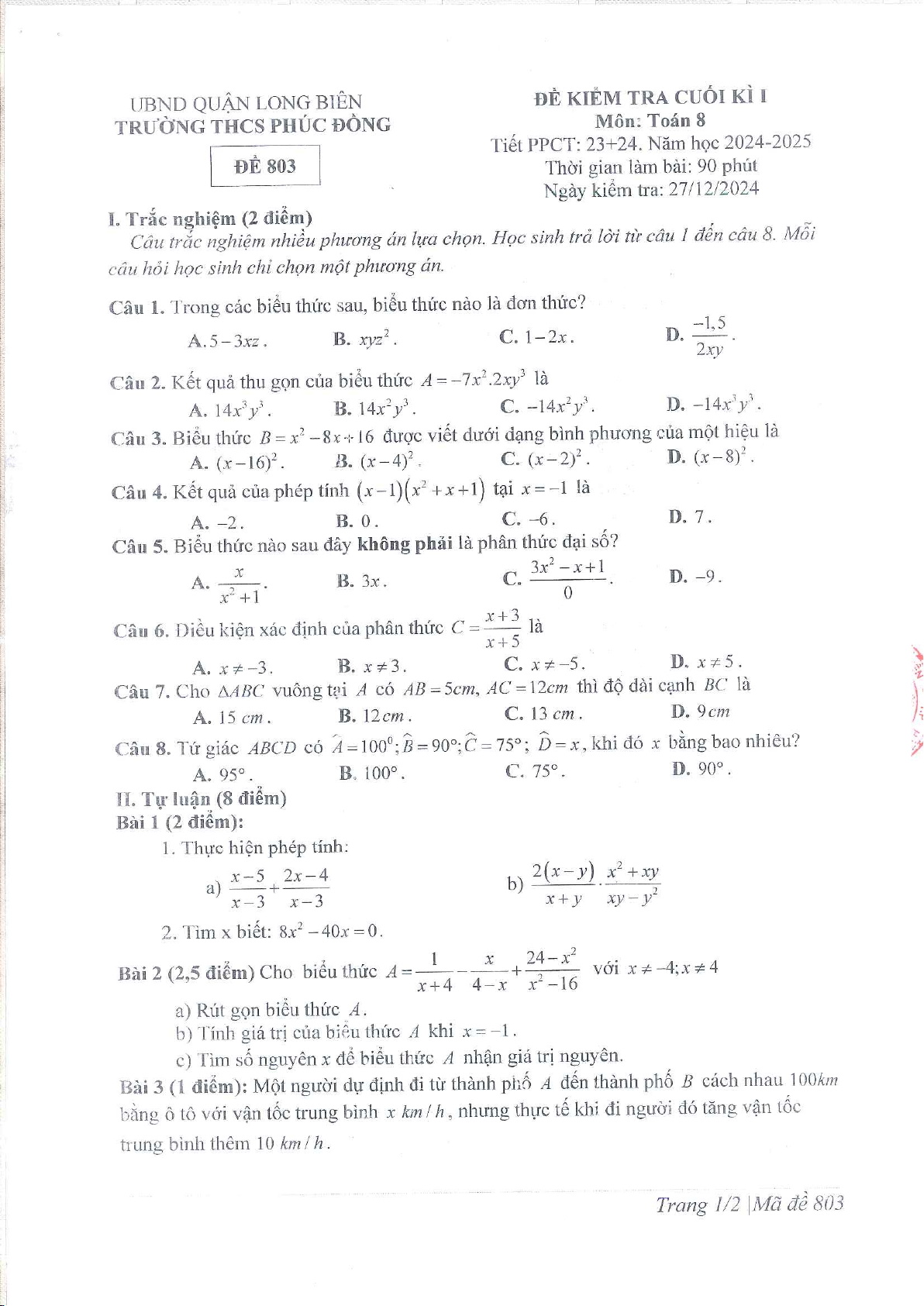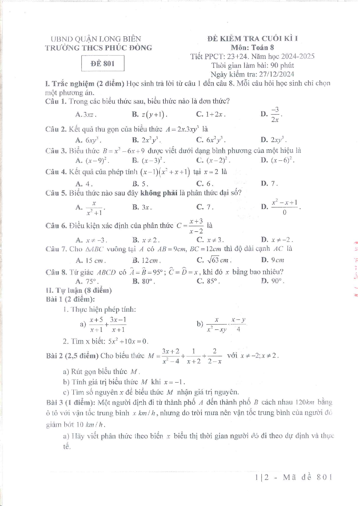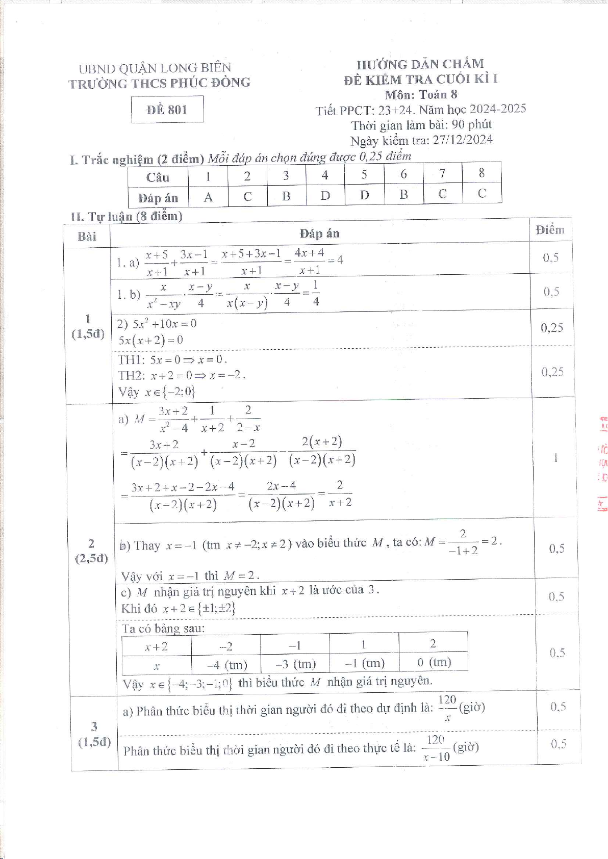Giới thiệu đến quý thầy, cô giáo và các em học sinh lớp 8 đề kiểm tra cuối học kì 1 môn Toán 8 năm học 2024 – 2025 trường THCS Phúc Đồng, quận Long Biên, thành phố Hà Nội. Kỳ thi được diễn ra vào ngày 27 tháng 12 năm 2024. Đề thi có đáp án chi tiết và hướng dẫn chấm điểm mã đề 801 – 802 – 803.