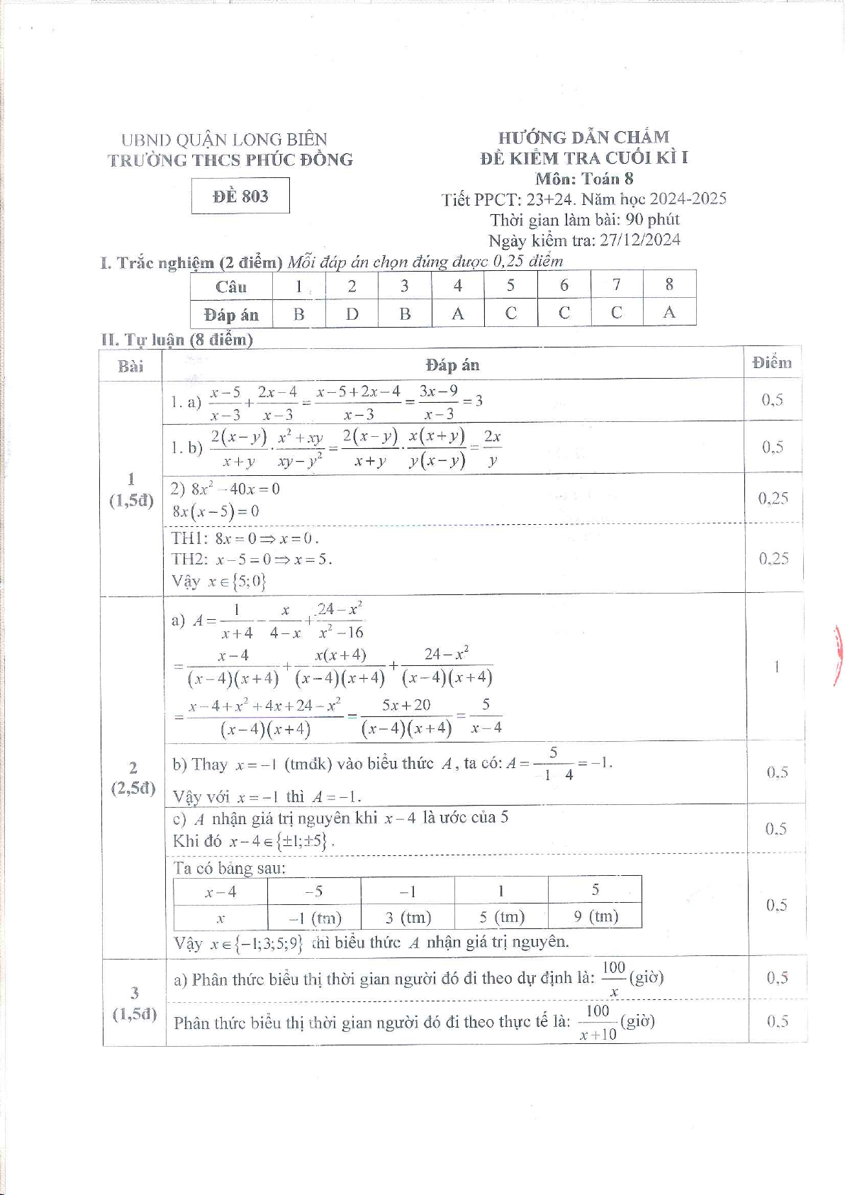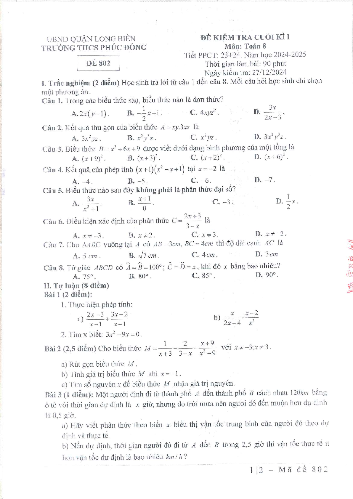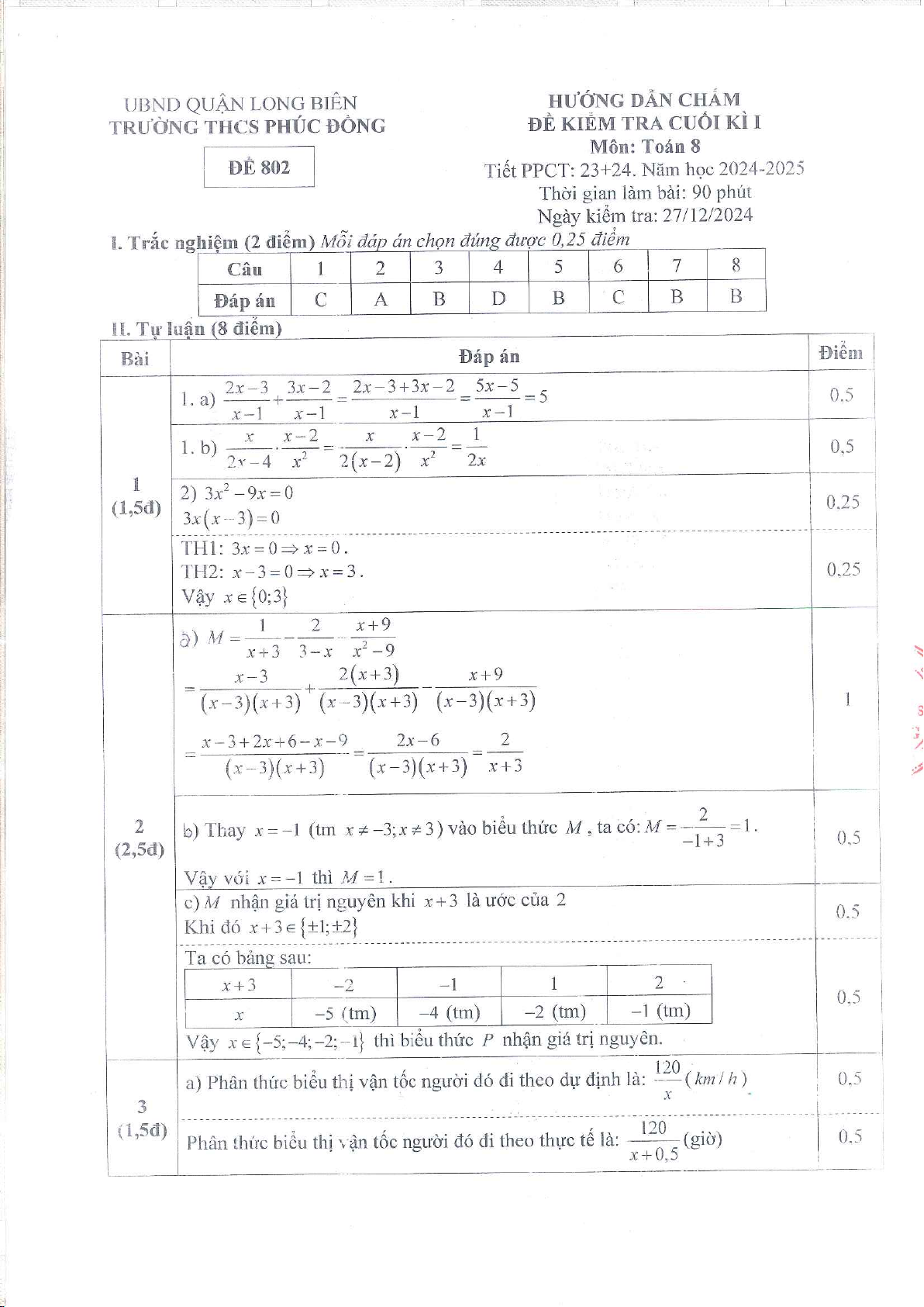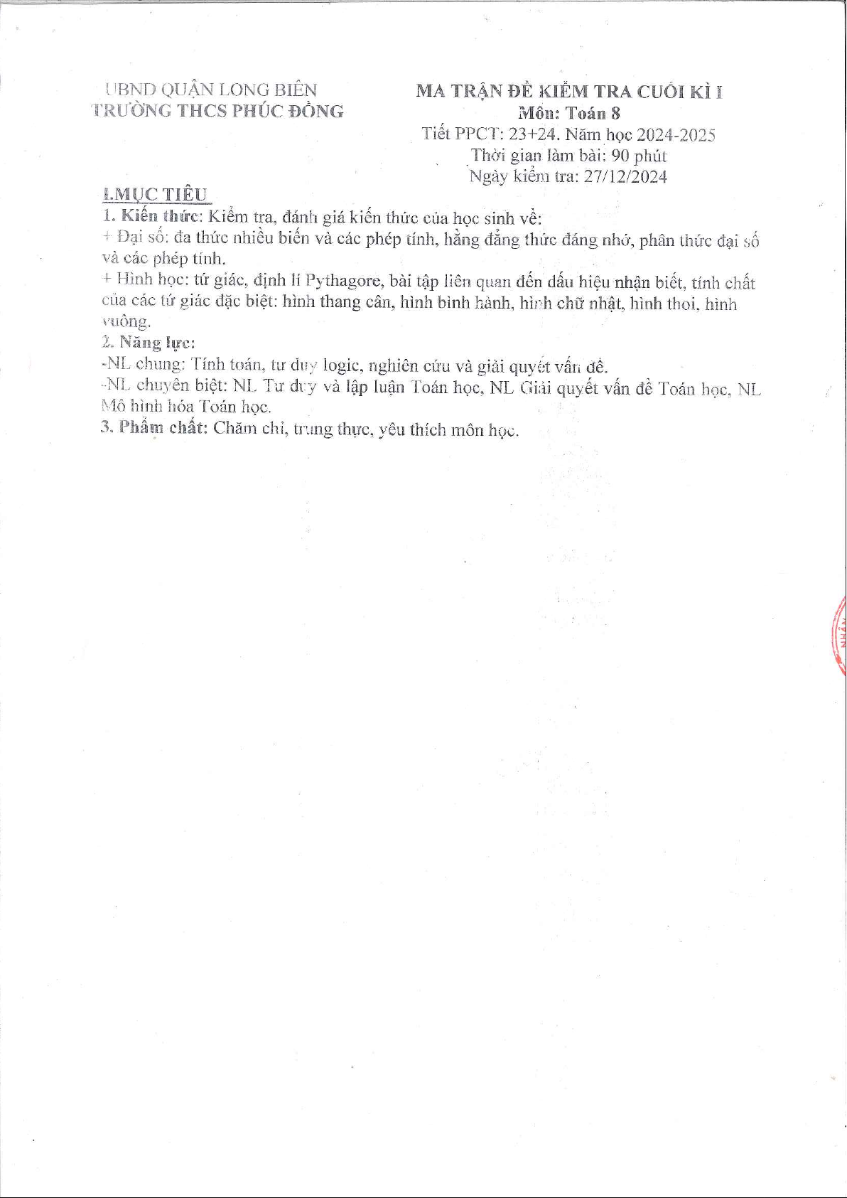 Giới thiệu đến quý thầy, cô giáo và các em học sinh lớp 8 đề kiểm tra cuối học kì 1 môn Toán 8 năm học 2024 – 2025 trường THCS Phúc Đồng, quận Long Biên, thành phố Hà Nội. Kỳ thi được diễn ra vào ngày 27 tháng 12 năm 2024. Đề thi có đáp án chi tiết và hướng dẫn chấm điểm mã đề 801 – 802 – 803.