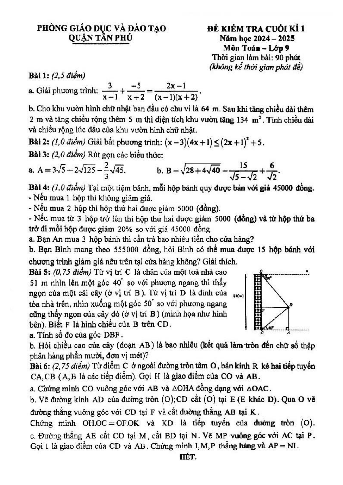 Đề cuối kì 1 Toán 9 năm 2024 – 2025 phòng GD&ĐT Tân Phú – TP HCM
