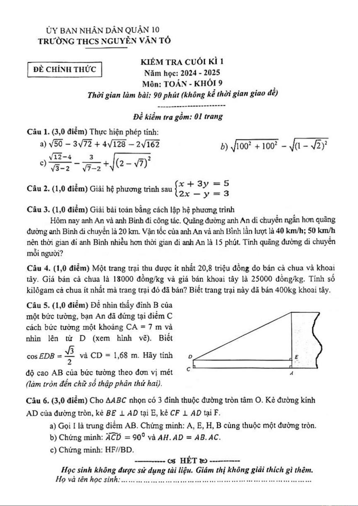 Đề cuối kì 1 Toán 9 năm 2024 – 2025 trường THCS Nguyễn Văn Tố – TP HCM
