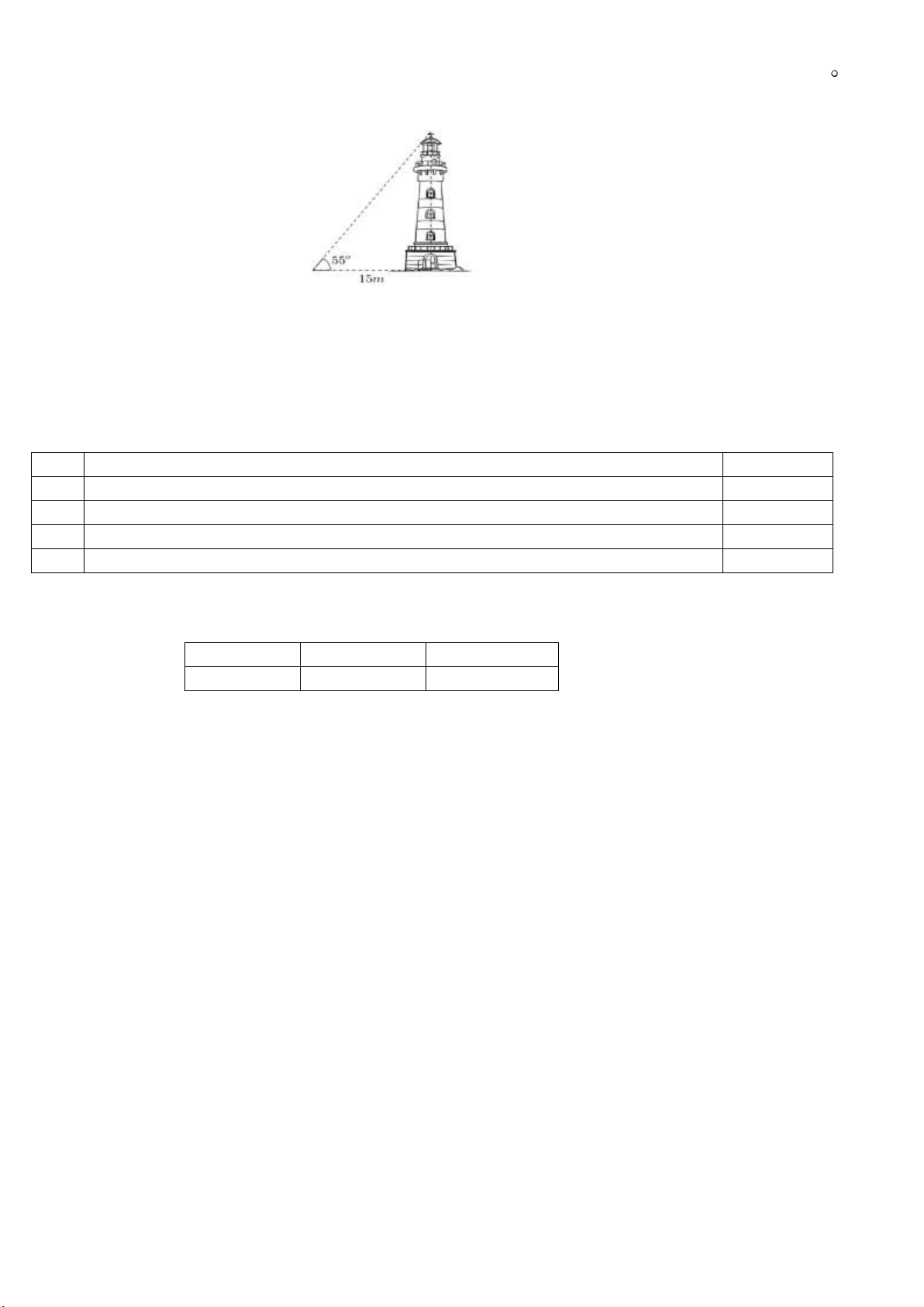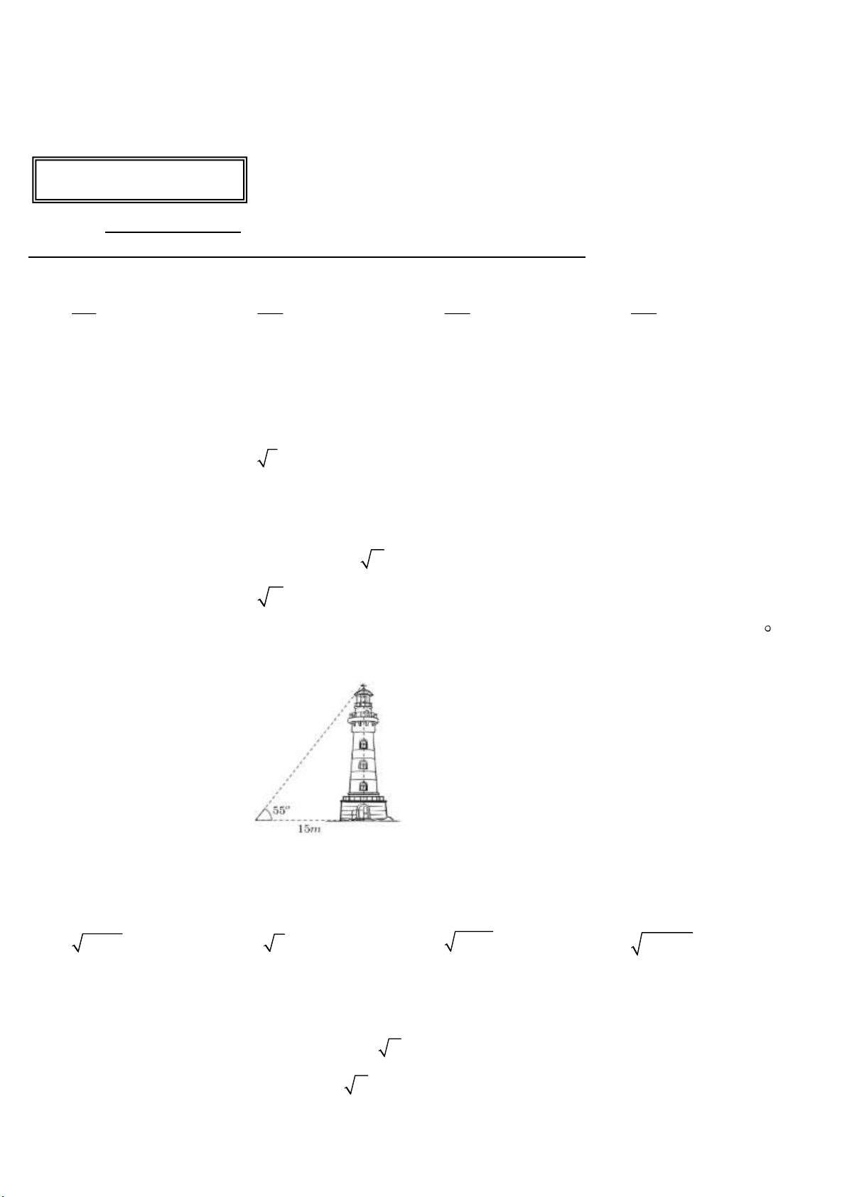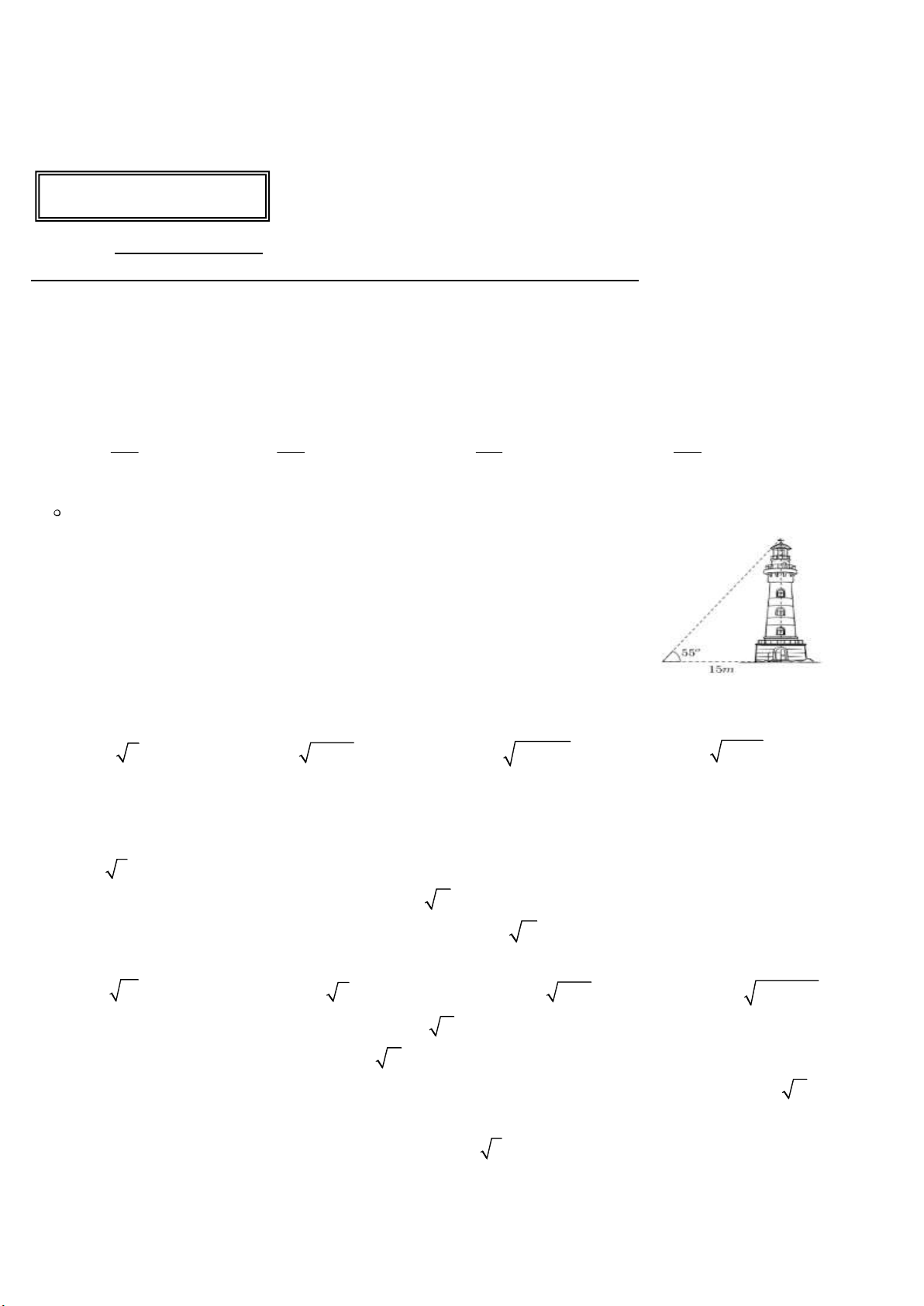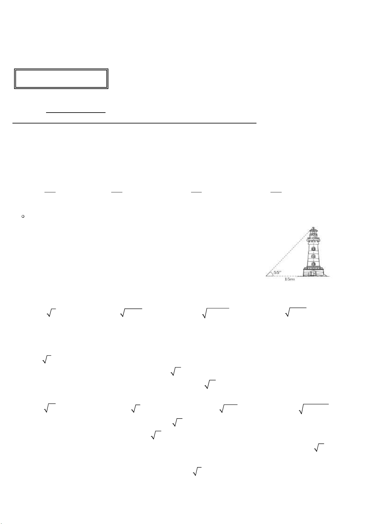 Câu 11. Một tòa tháp có bóng trên mặt đất dài 15 m, biết rằng góc tạo bởi tia nắng mặt trời với mặt đất là 55 (xem