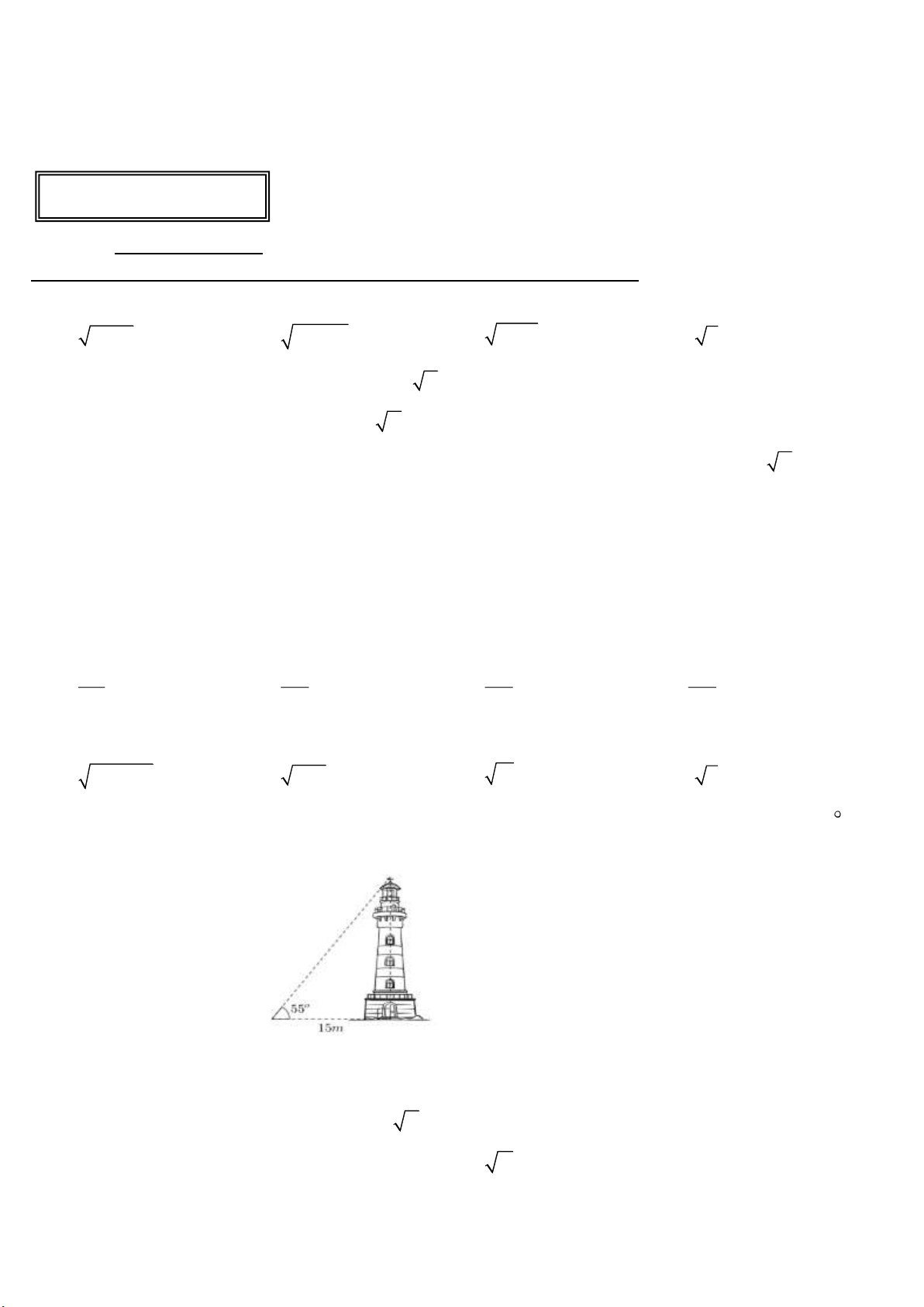 Câu 7. Một tòa tháp có bóng trên mặt đất dài 15 m, biết rằng góc tạo bởi tia nắng mặt trời với mặt đất là 55