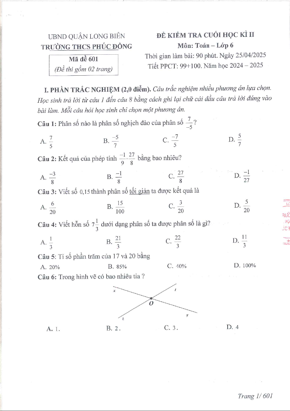 Đề cuối kỳ 2 Toán 6 năm 2024 – 2025 phòng GD&ĐT Phú Xuyên – Hà Nội
