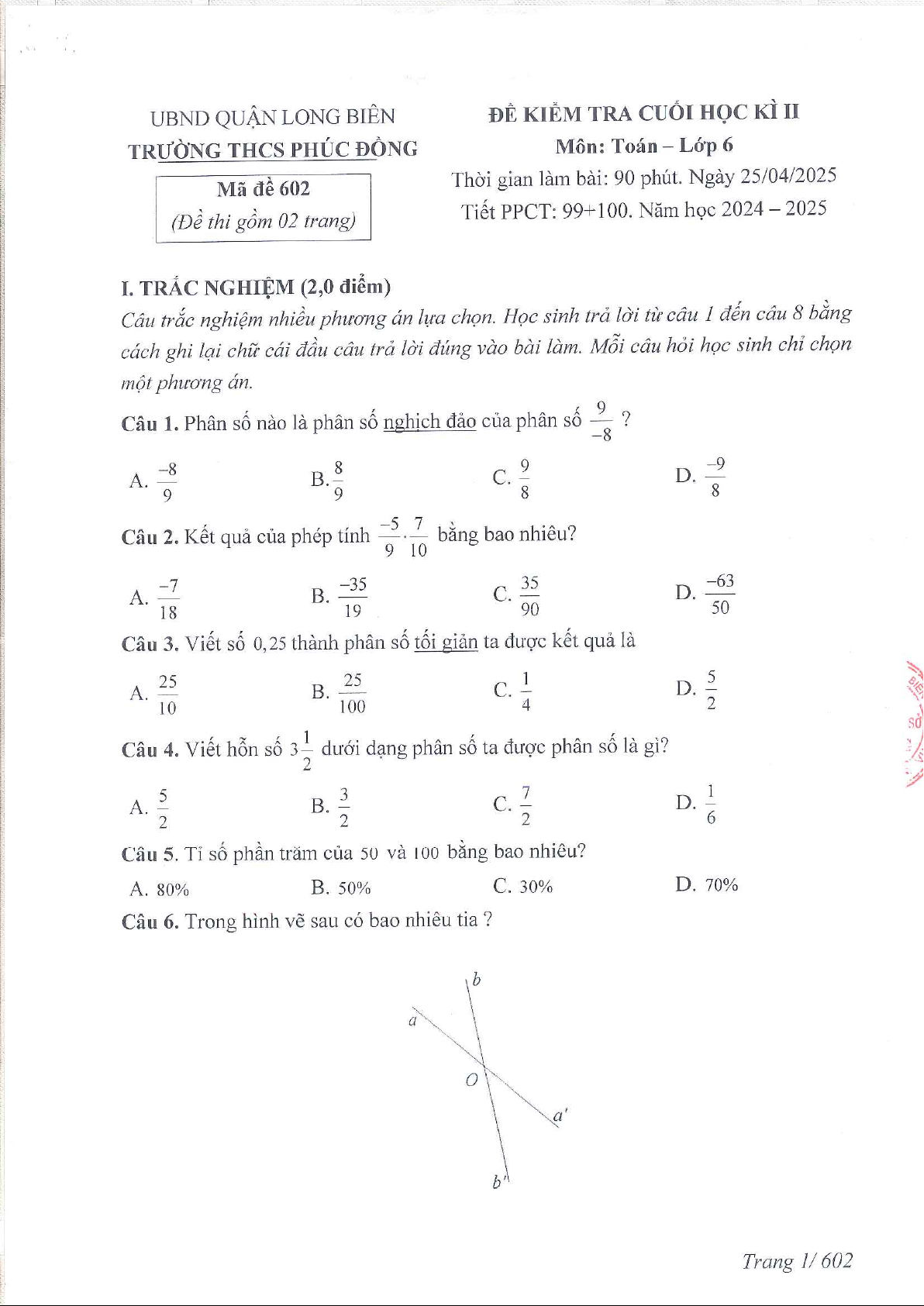 Đề cuối kì 2 Toán 6 năm 2024 – 2025 trường THCS Phúc Đồng – Hà Nội