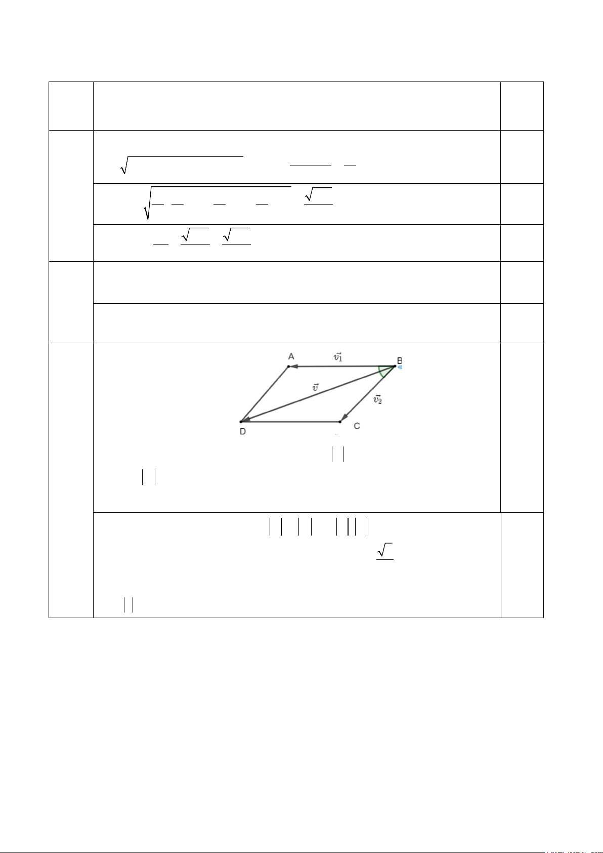 (0,5đ) Ta có: = + v v v và ( , v v 45° = . 1 2 ) 1 2 v ( v v v v 2v v v v 2 v v cos45 1 2 )2 2 2 2 2 2 ° = + = + + ⋅ = + + ⋅ ⋅ 1 2 1 2 1 2 1 2 2 2 2 = 750 + 40 + 2.750.40. ≈ 606526,4068 2 0.25đ