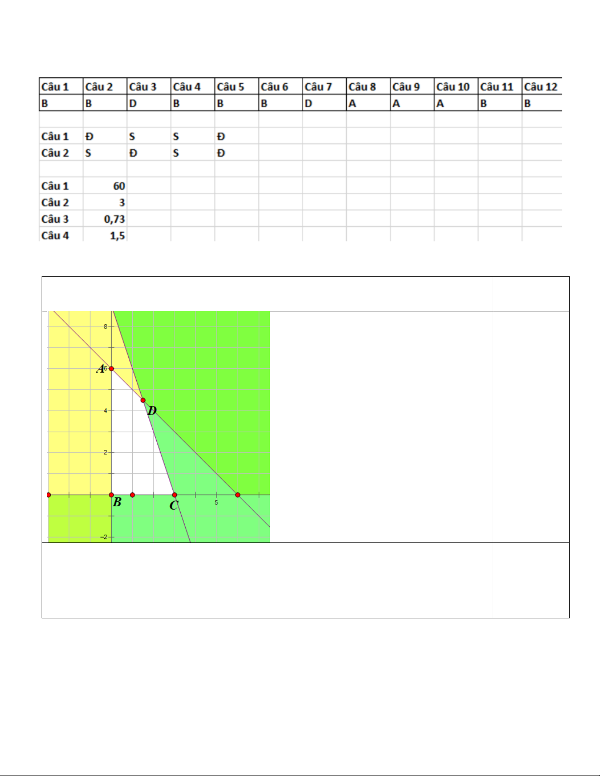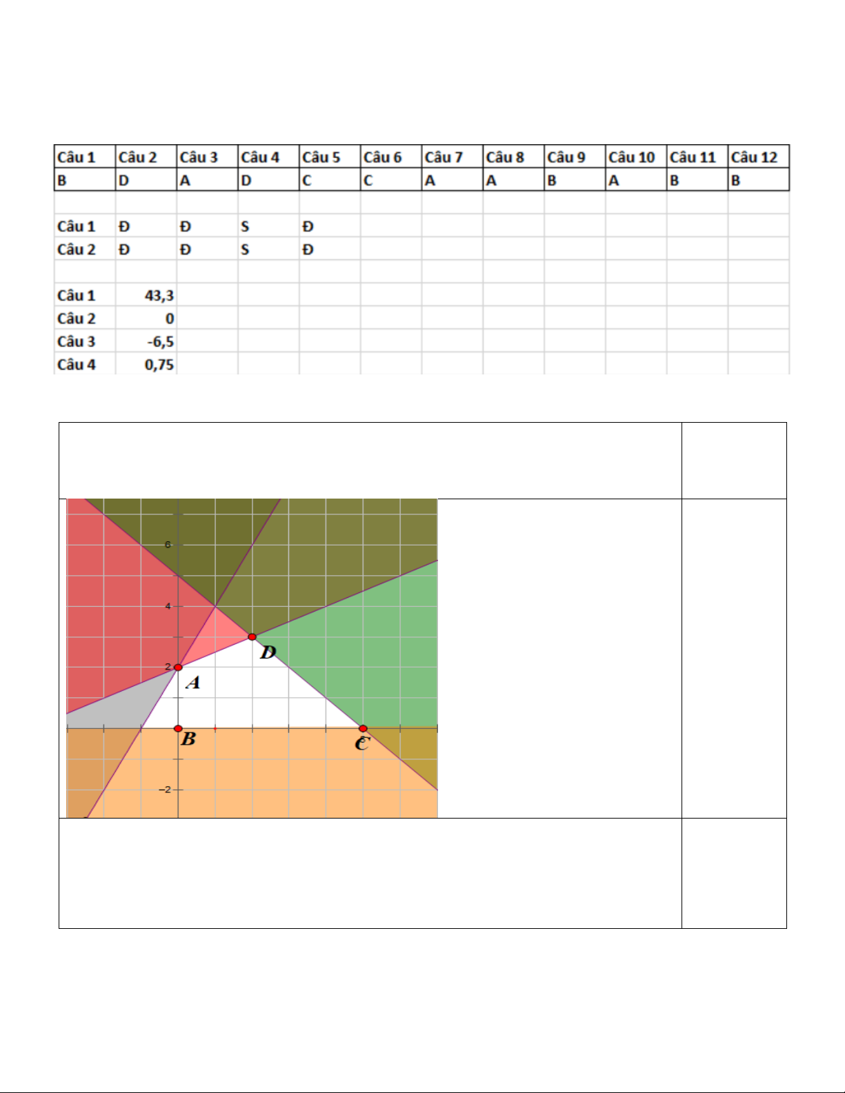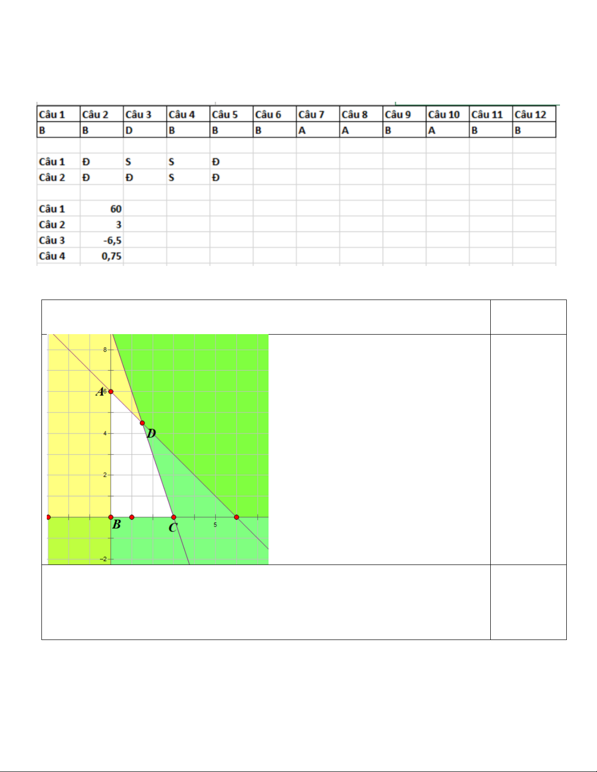 Tìm được các giao điểm A(0;6), B(0;0) C(4;0), D(3/2;9/2) 0,25 Kết luận miền nghiệm Câu 2: