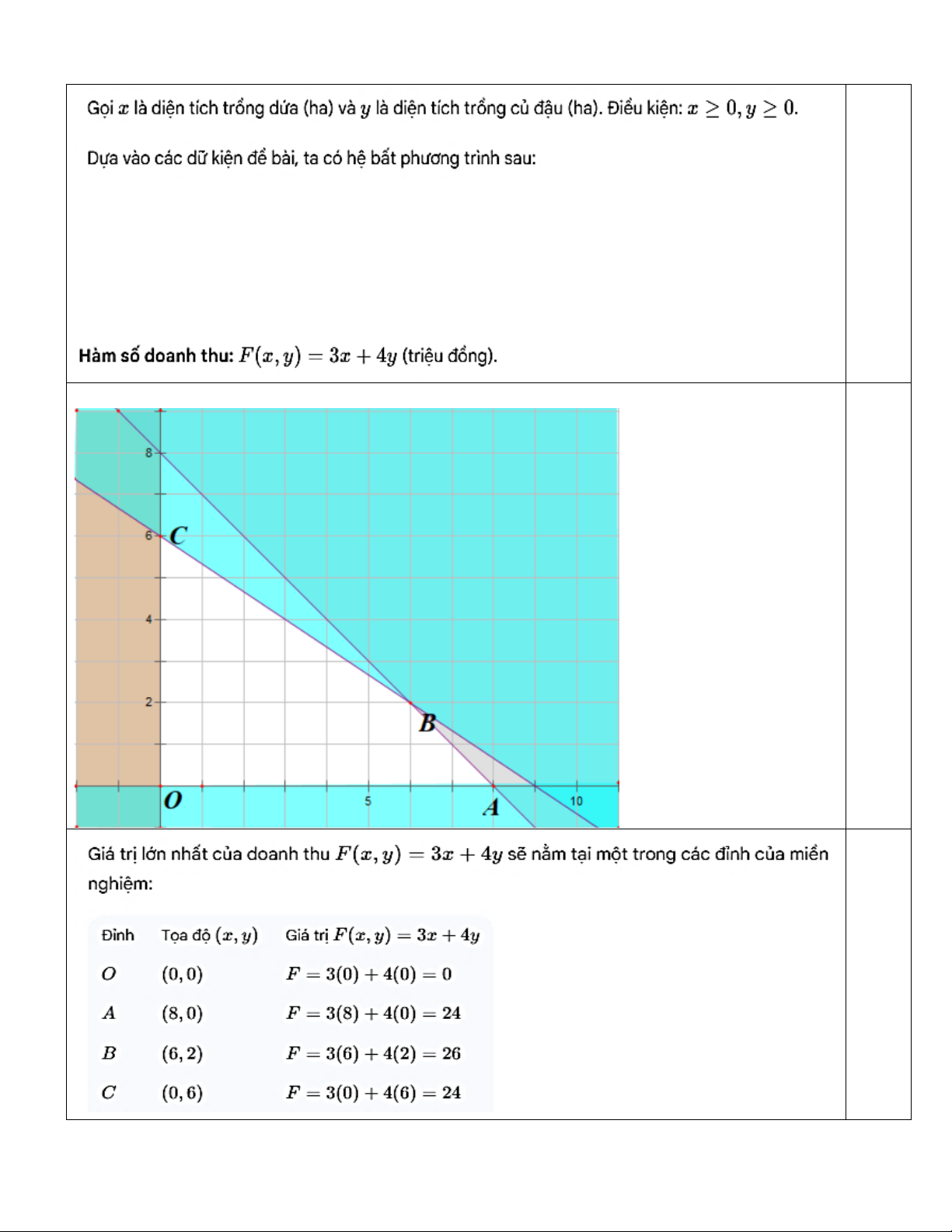 Hỏi cần trồng mỗi loại cây trên với diện tích là bao nhiêu ha để thu được nhiều tiền nhất, biết rằng