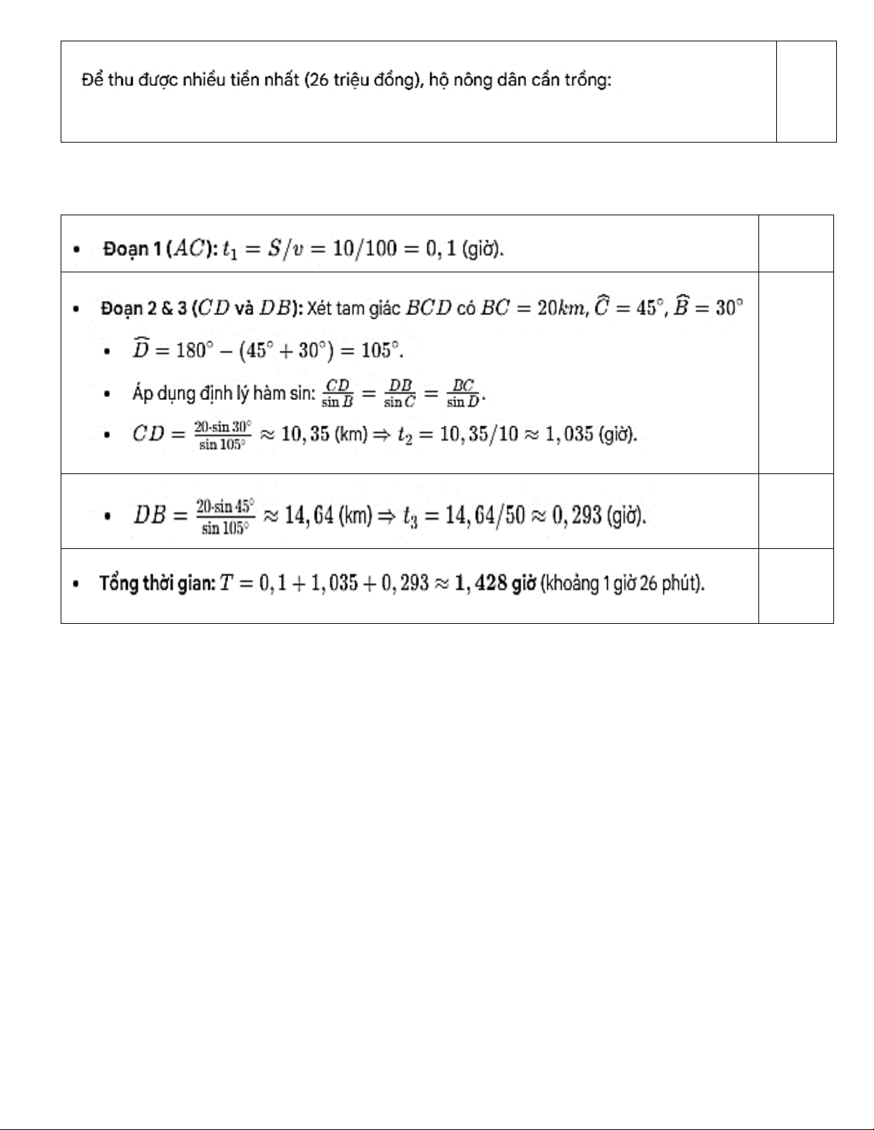 DB với vận tốc là 50km / h . Biết rằng: BC 20km , DCB 45 và DBC 30 . Hỏi vận
