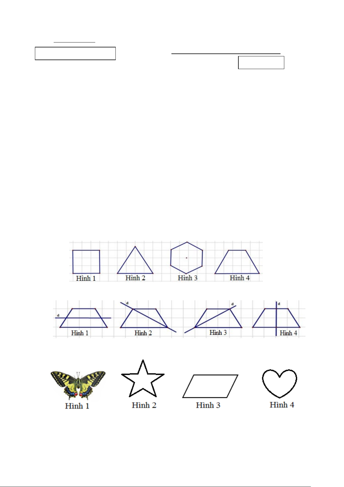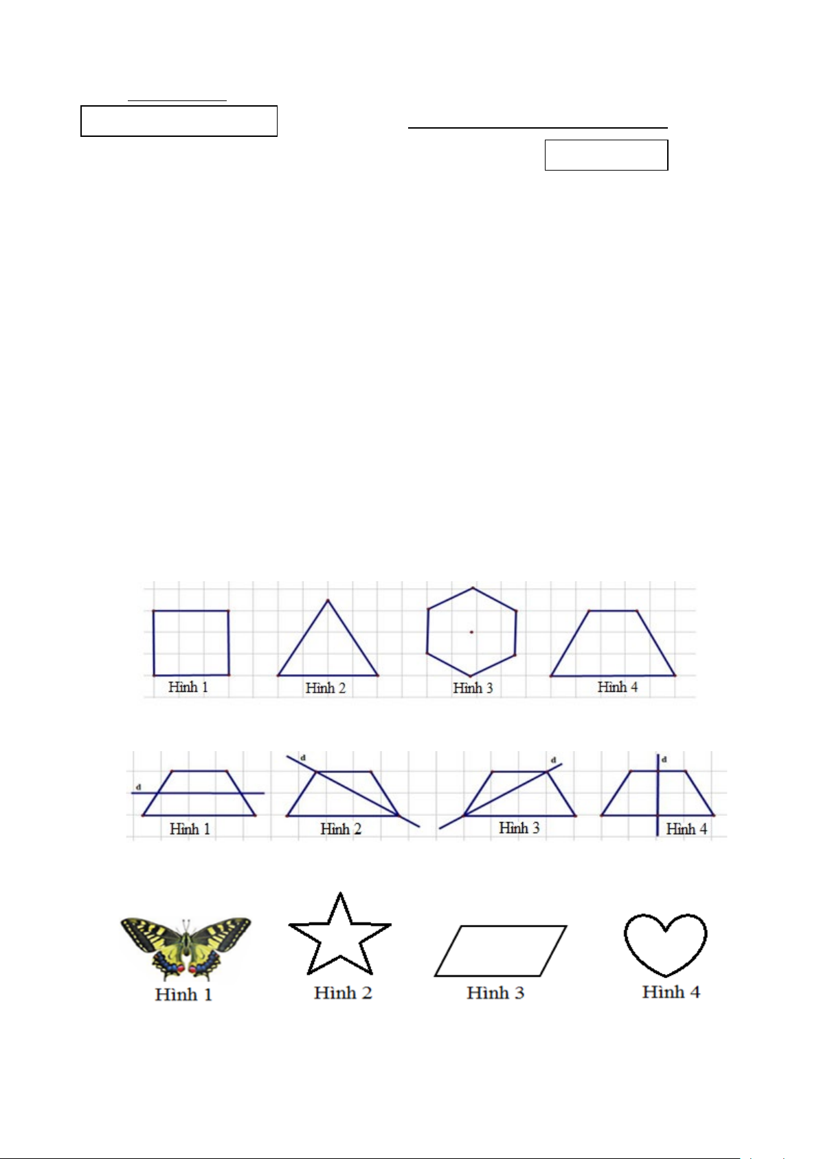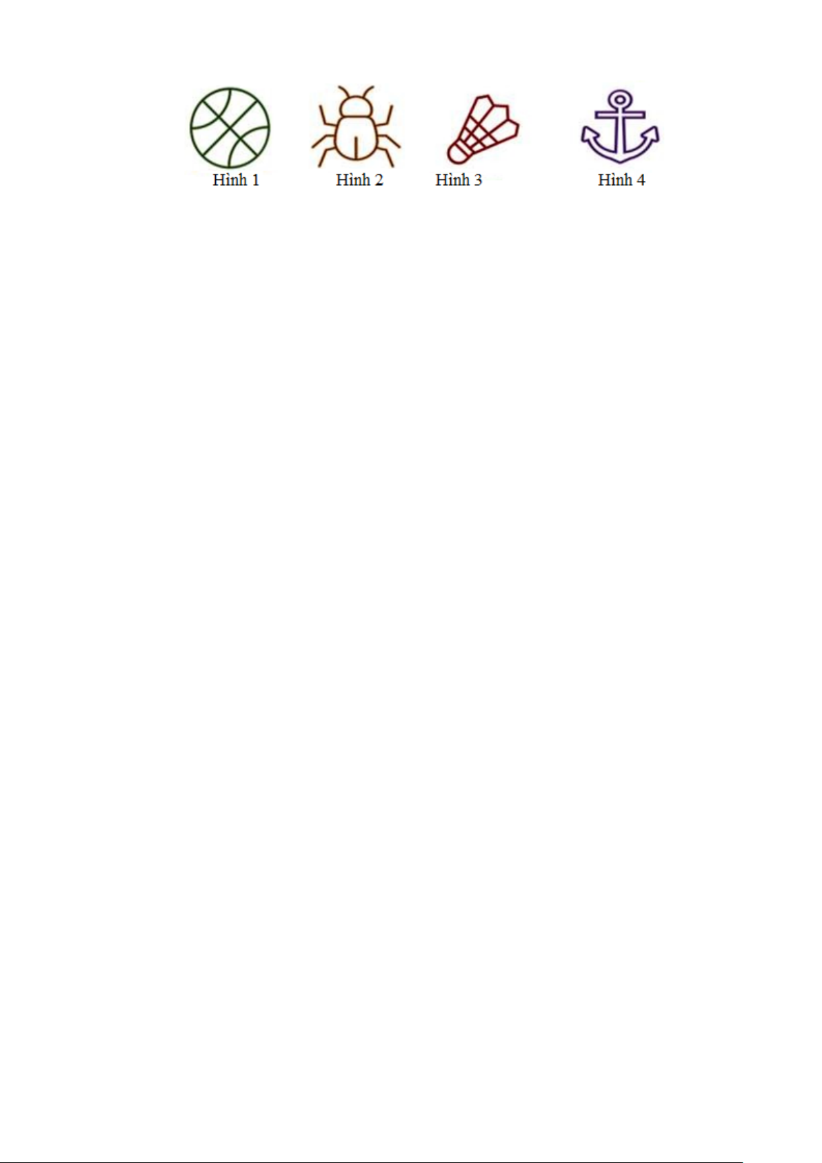Câu 10: Trong các hình sau hình nào không có trục đối xứng? A. Hình 4. B. Hình 3. C. Hình 2. D. Hình 1.