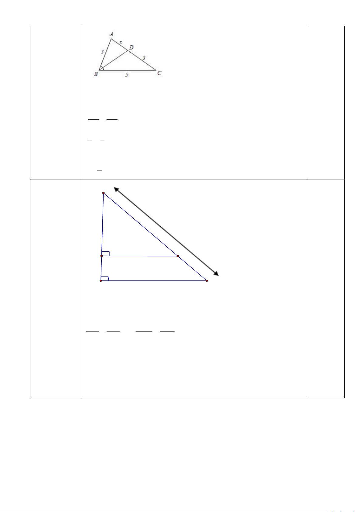 ΔABC có BD là đường phân giác góc B (1) Nên CD DA = 0,25 CB AB 3 x = 5 3 .5 x 0,25 = 3.3 9 x = . 0,25 5 C 6 3x 13,5 B D x Bài 5 A E (1) Hình vẽ đúng