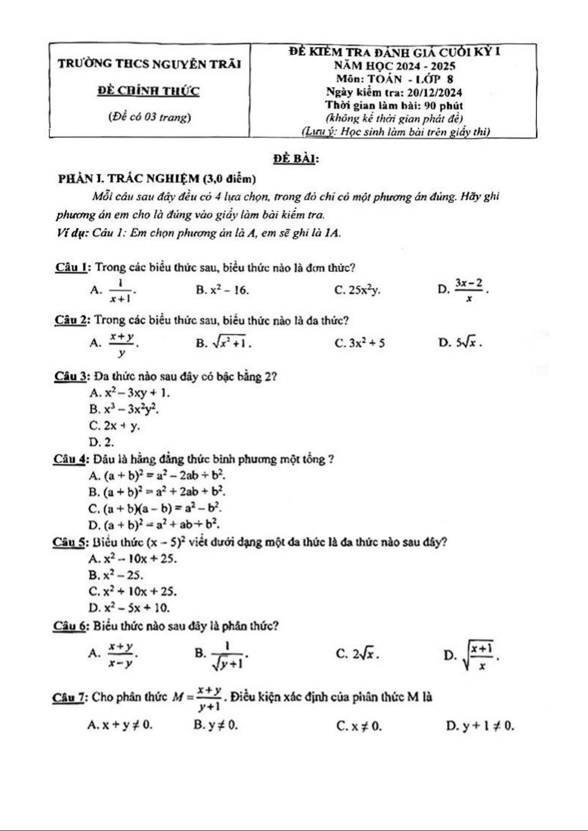 Giới thiệu đến quý thầy, cô giáo và các em học sinh lớp 8 đề kiểm tra đánh giá cuối học kỳ 1 môn Toán 8 năm học 2024 – 2025 trường THCS Nguyễn Trãi, thành phố Hồ Chí Minh. Đề thi cấu trúc 30% trắc nghiệm (12 câu) + 70% tự luận (05 câu), thời gian làm bài 90 phút. Kỳ thi được diễn ra vào ngày 20 tháng 12 năm 2024.