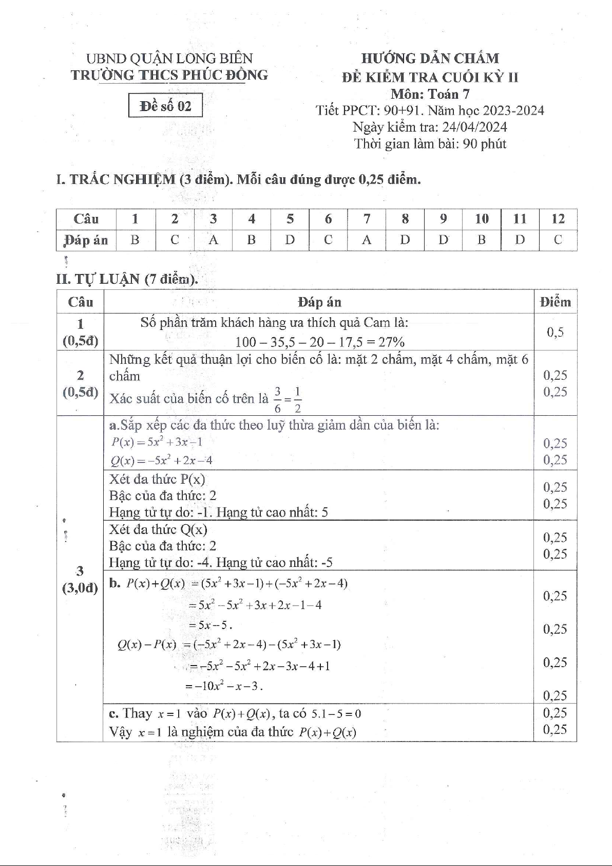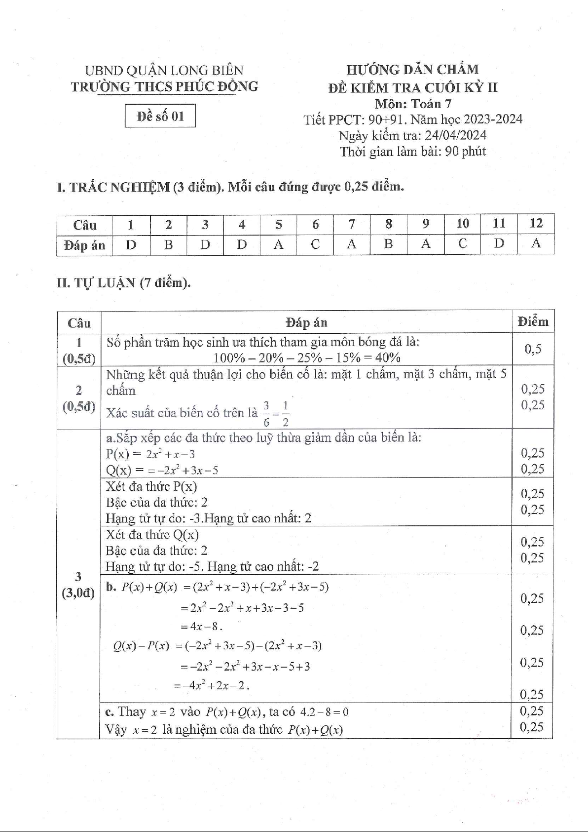Giới thiệu đến quý thầy, cô giáo và các em học sinh lớp 7 đề kiểm tra cuối học kỳ 2 môn Toán 7 năm học 2023 – 2024 trường THCS Phúc Đồng, quận Long Biên, thành phố Hà Nội; kỳ thi được diễn ra vào ngày 24 tháng 04 năm 2024; đề thi có đáp án và hướng dẫn chấm điểm.