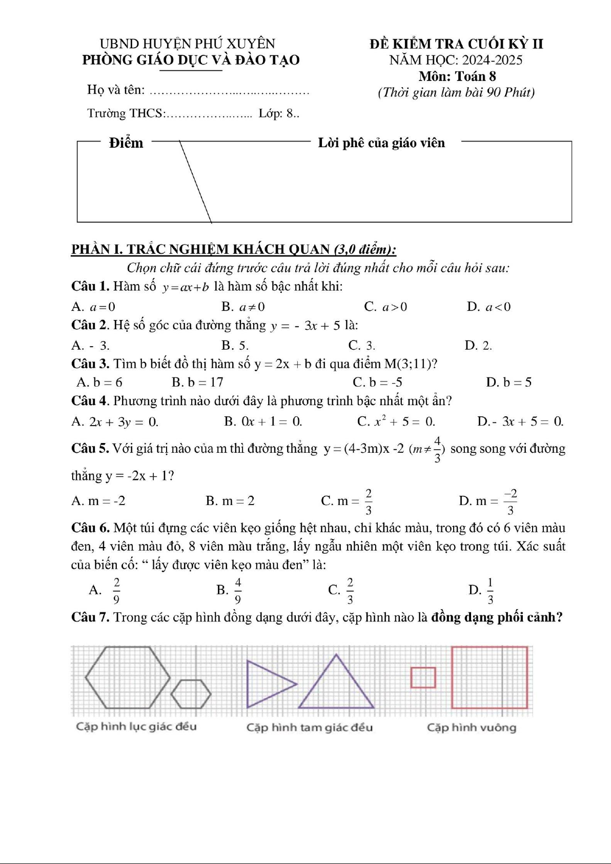 Đề cuối kỳ 2 Toán 8 năm 2024 – 2025 phòng GD&ĐT Phú Xuyên – Hà Nội