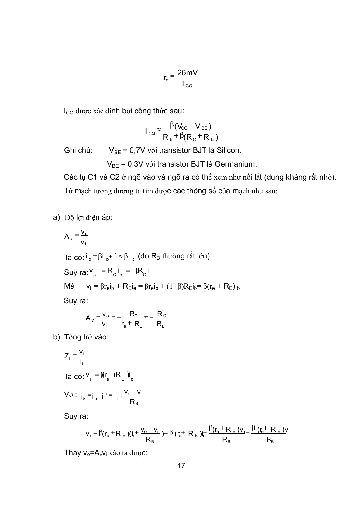 Từ mạch tương đương ta tìm được các thông số của mạch như sau: a) Độ lợi điện áp: v o A v v i