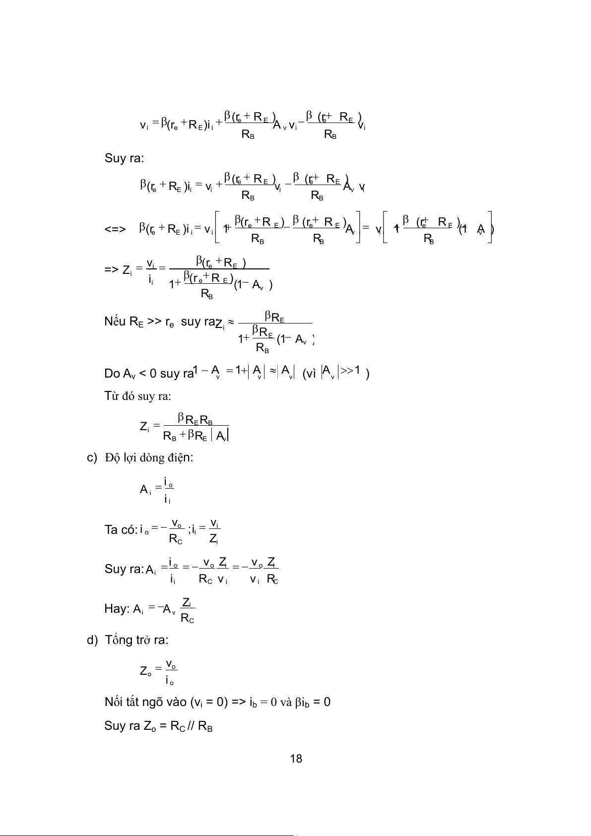 Thay vo=Avvi vào ta được: 17 (r R ) ( r R ) e E e E v i ( e r RE )i i A v vi vi RB B R Suy ra: (r R ) ( r R ) e E e E ( e r E R ) ii i v i v v A iv RB B R (r R ) ( r R ) (r R ) <=> e E e E e E e (r E R )i i vi 1 A v i v 1 (1 v A ) R B B R B R v ( r R ) => i e E Z i i ( r e R E ) i 1 (1 v A ) B R Nếu R RE E >> re suy ra: Z i RE 1 (1 v A ) RB Do A 1 A 1 A A A 1 v < 0 suy ra (vì ) v v v v Từ đó suy ra: RE B R Z i R B E R v A c) Độ lợi dòng điện: i o A i i i v v Ta có: o i i o ; ii RC i Z i v Z v Z Suy ra: o o i o i A i ii RC v i v i C R Hay: i Z A i A v RC d) Tổng trở ra: o v Z o i o