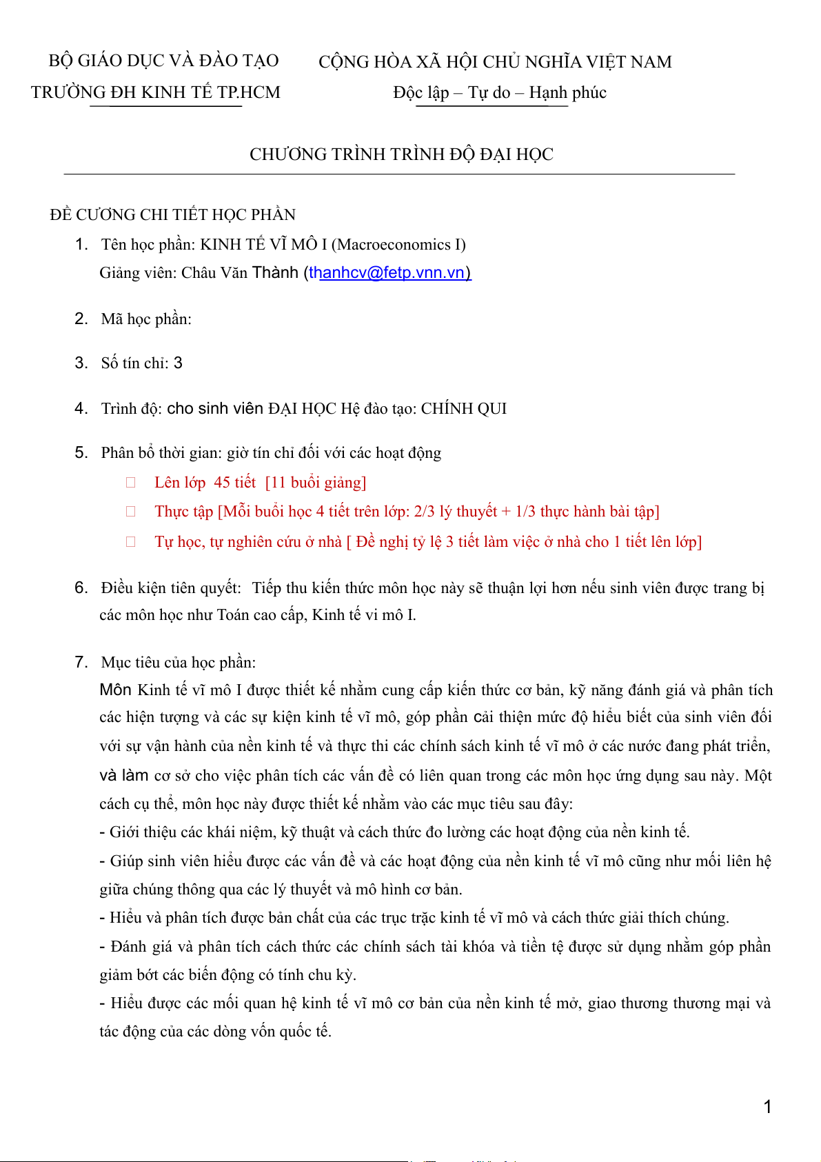 1. Tên học phần: KINH TẾ VĨ MÔ I (Macroeconomics I)