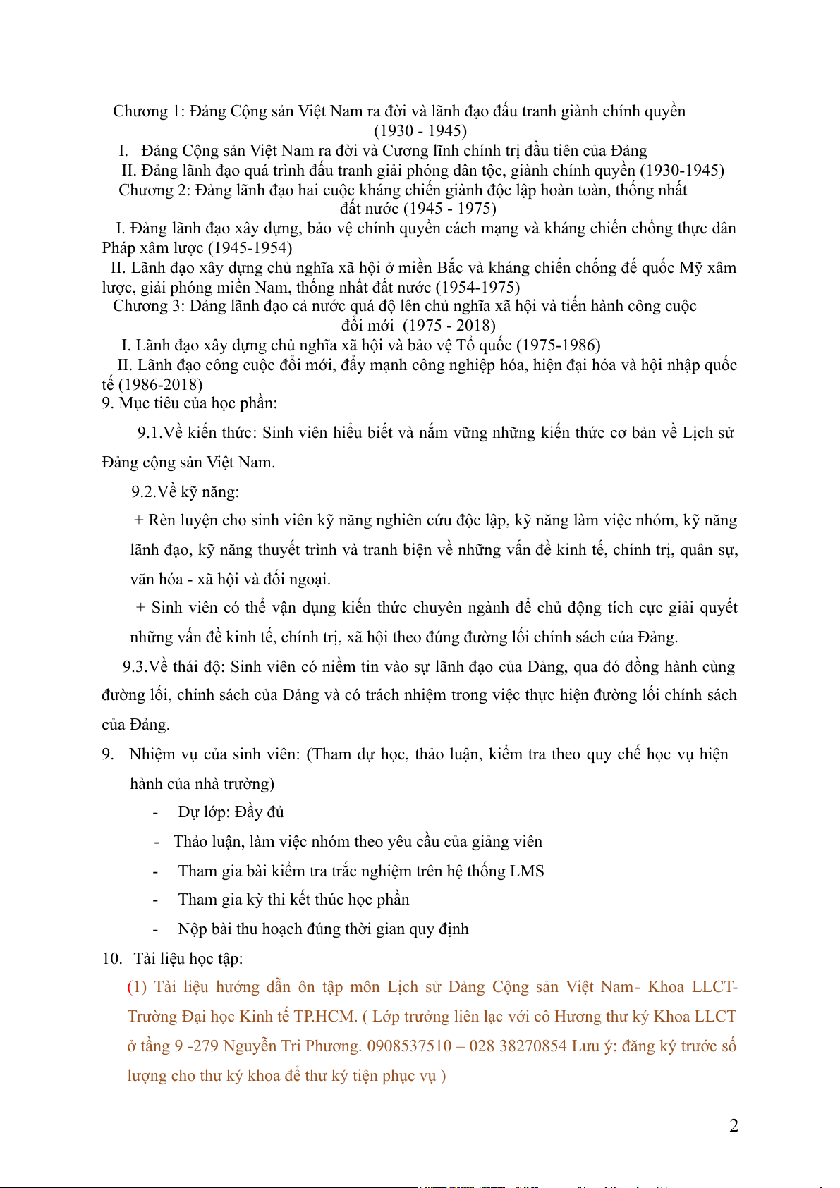 8. Mô tả vắn tắt nội dung học phần: Môn Lịch sử Đảng Cộng Sản Việt Nam là môn học