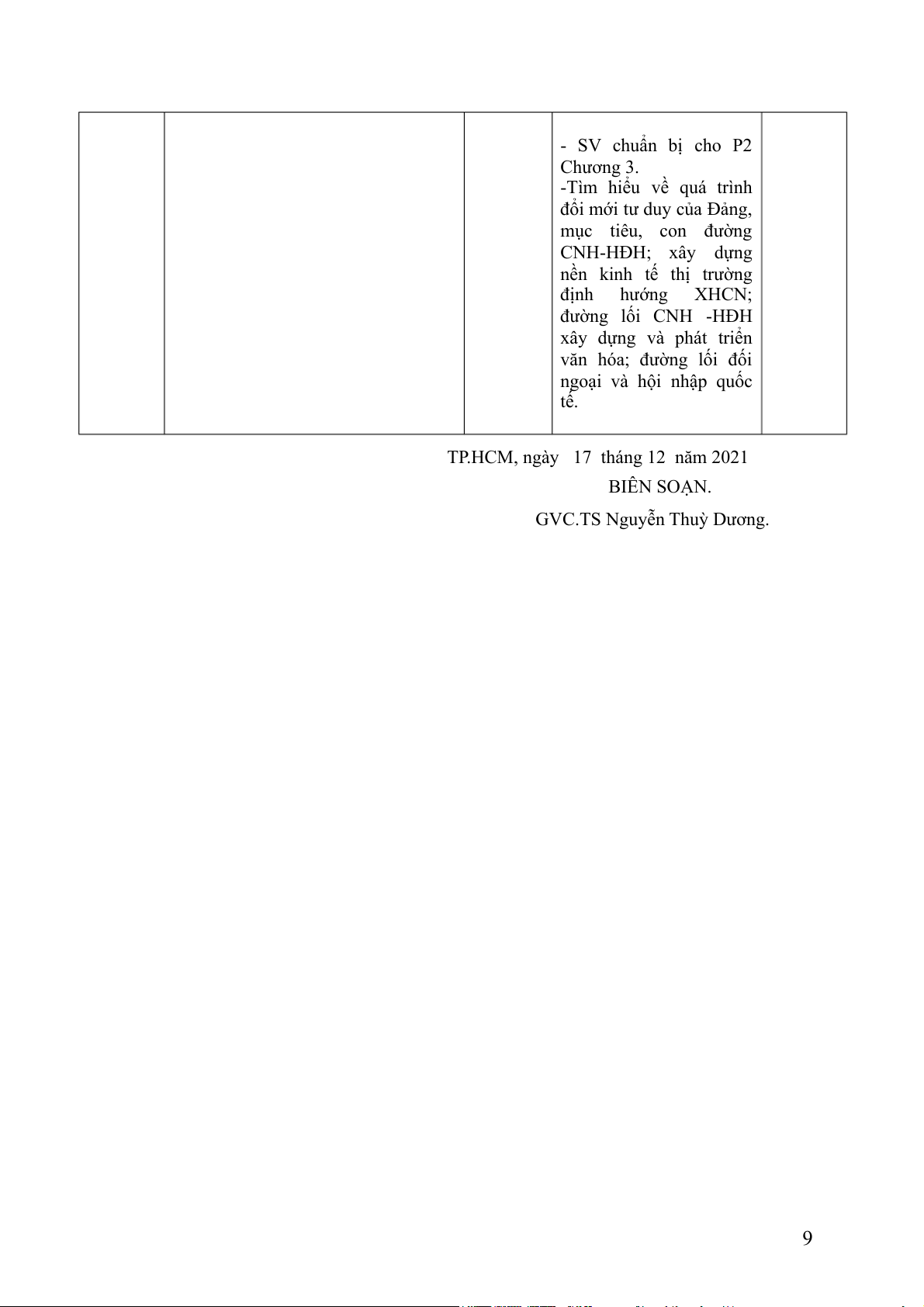 9. Nhiệm vụ của sinh viên: (Tham dự học, thảo luận, kiểm tra theo quy chế học vụ hiện hành của nhà trường) - Dự lớp: Đầy đủ