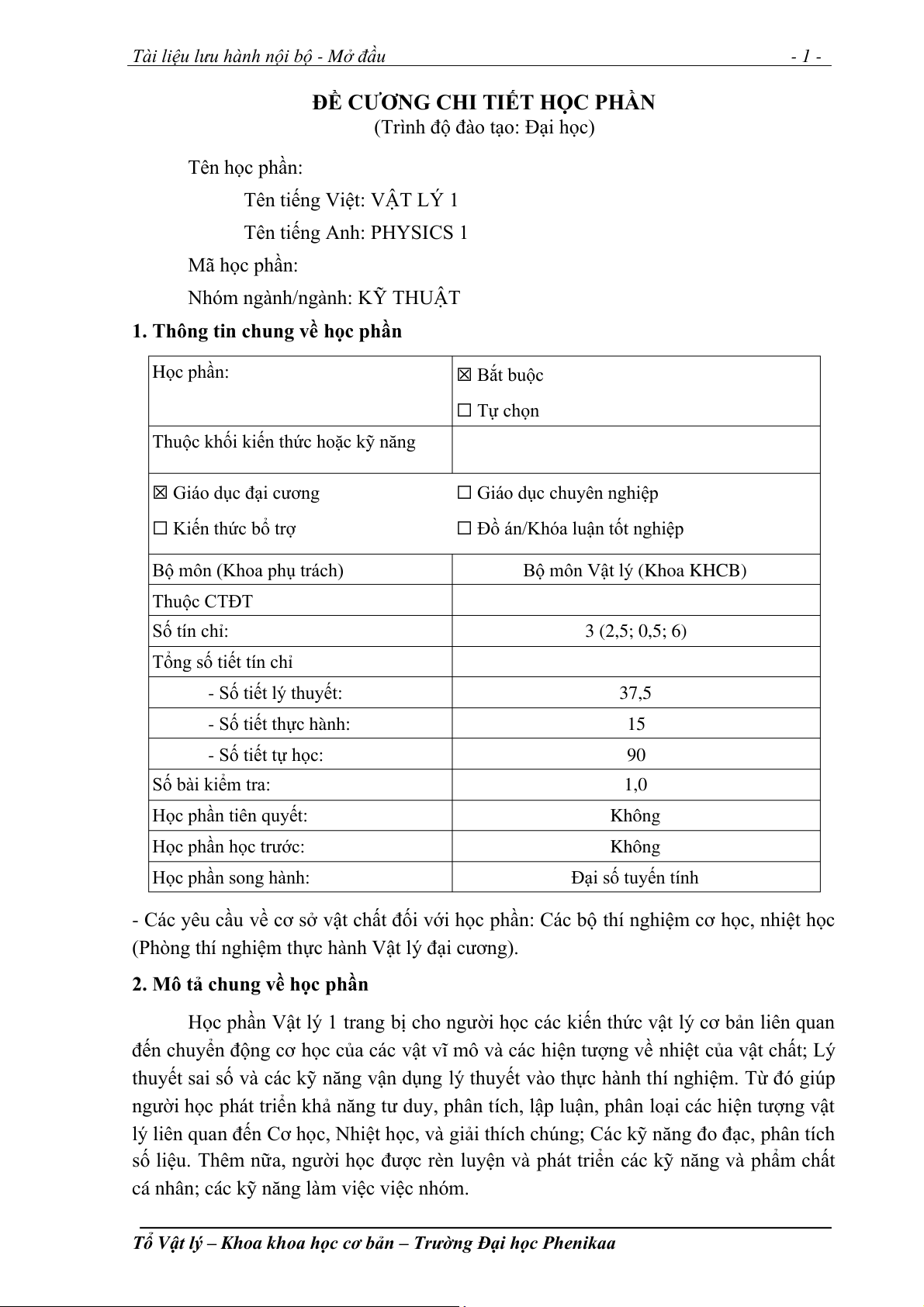 Tên tiếng Việt: VẬT LÝ 1 Tên tiếng Anh: PHYSICS 1 Mã học phần: