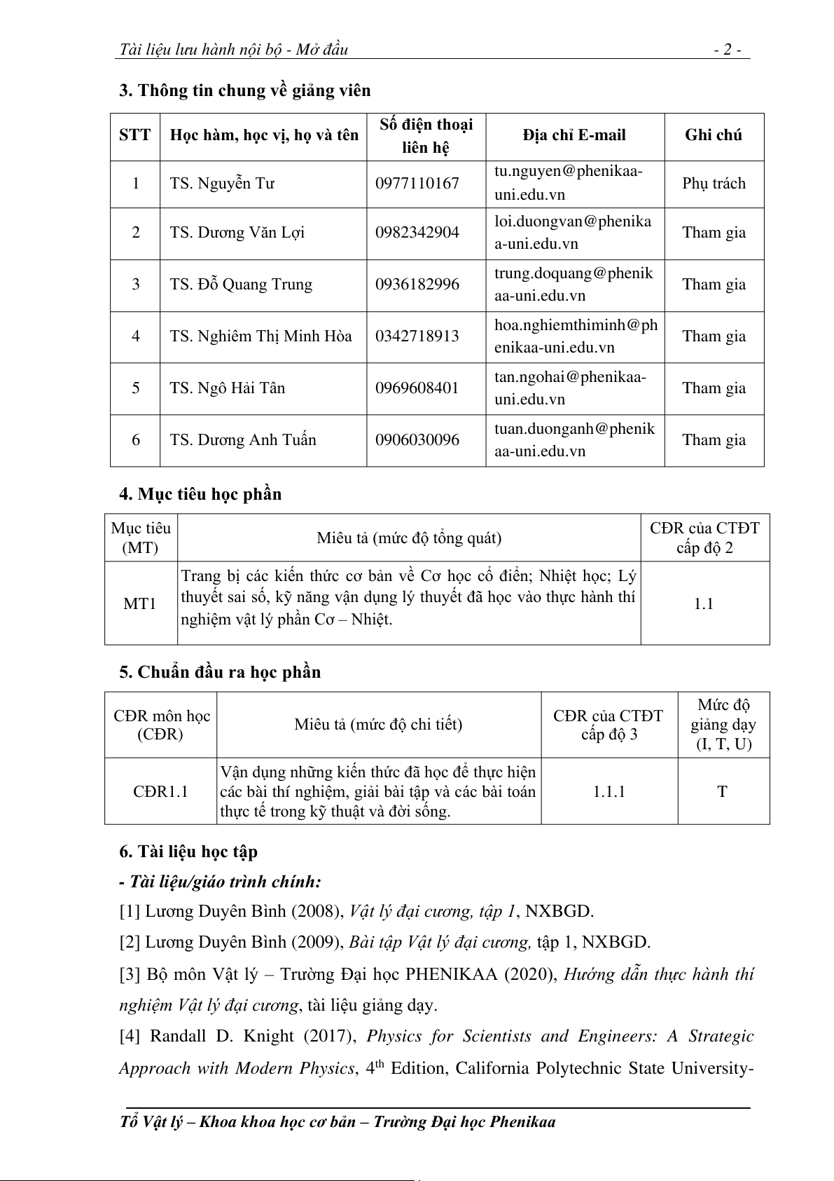Bộ môn Vật lý (Khoa KHCB) Thuộc CTĐT Số tín chỉ: 3 (2,5; 0,5; 6) Tổng số tiết tín chỉ - Số tiết lý thuyết: 37,5 - Số tiết thực hành: 15 - Số tiết tự học: 90 Số bài kiểm tra: 1,0 Học phần tiên quyết: Không Học phần học trước: Không Học phần song hành: Đại số tuyến tính