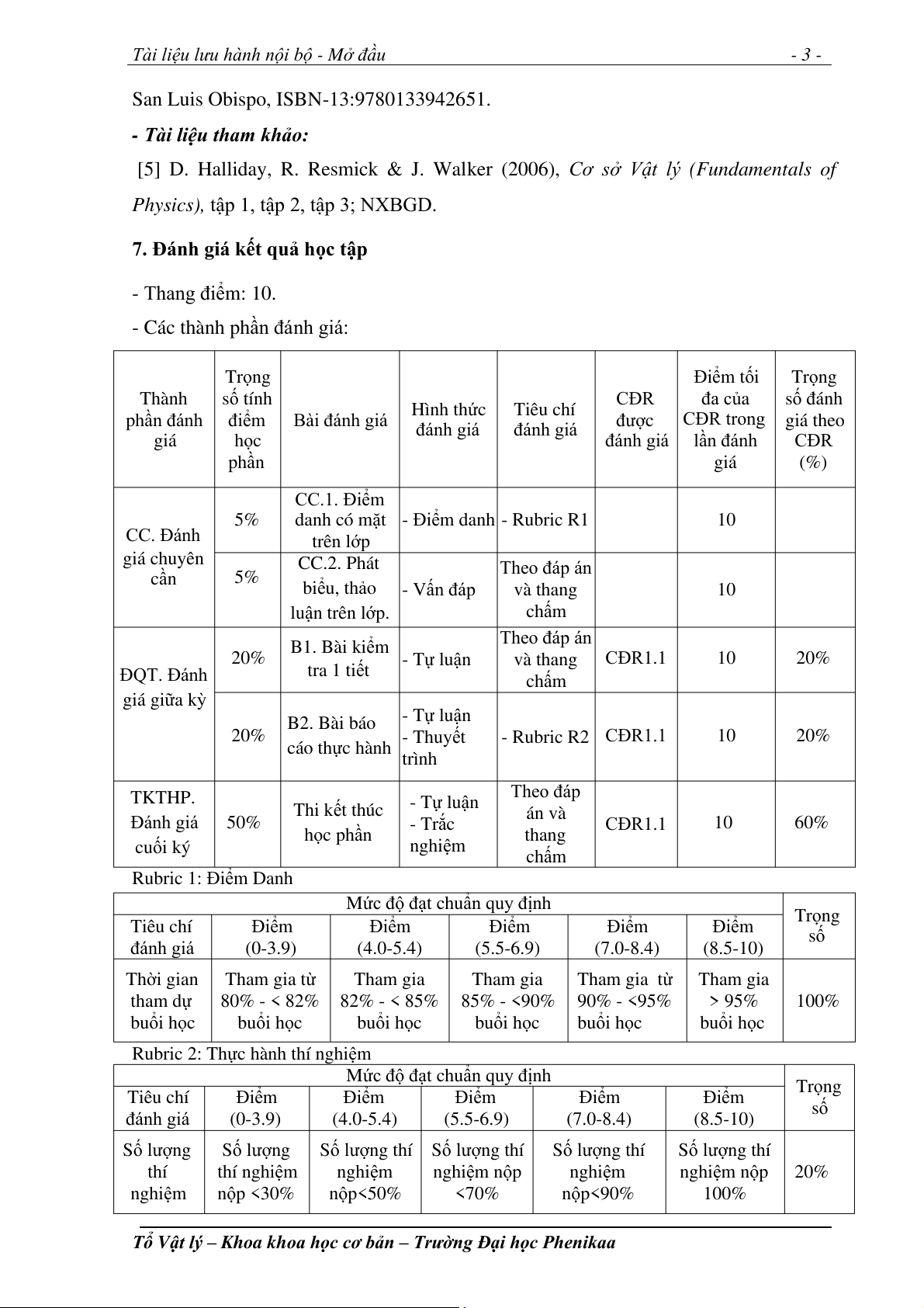 danh có mặt - Điểm danh - Rubric R1 10 CC. Đánh trên lớp giá chuyên CC.2. Phát c Theo đáp án ần 5% bi ểu, thảo - V ấn đáp và thang 10 luận trên lớp. chấm Theo đáp án 20% B1. Bài kiểm - T l ự uận và thang CĐR1.1 10 20% ĐQT. Đánh tra 1 tiết chấm giá gi a ữ kỳ - T l ự uận B2. Bài báo 20% cáo th c - Thuyết - Rubric R2 CĐR1.1 10 20% ự hành trình TKTHP. Theo đáp Thi kết thúc - T l ự uận án và Đánh giá 50% h - Trắc thang CĐR1.1 10 60% cu ọc phần ối ký nghiệm chấm Rubric 1: Điểm Danh