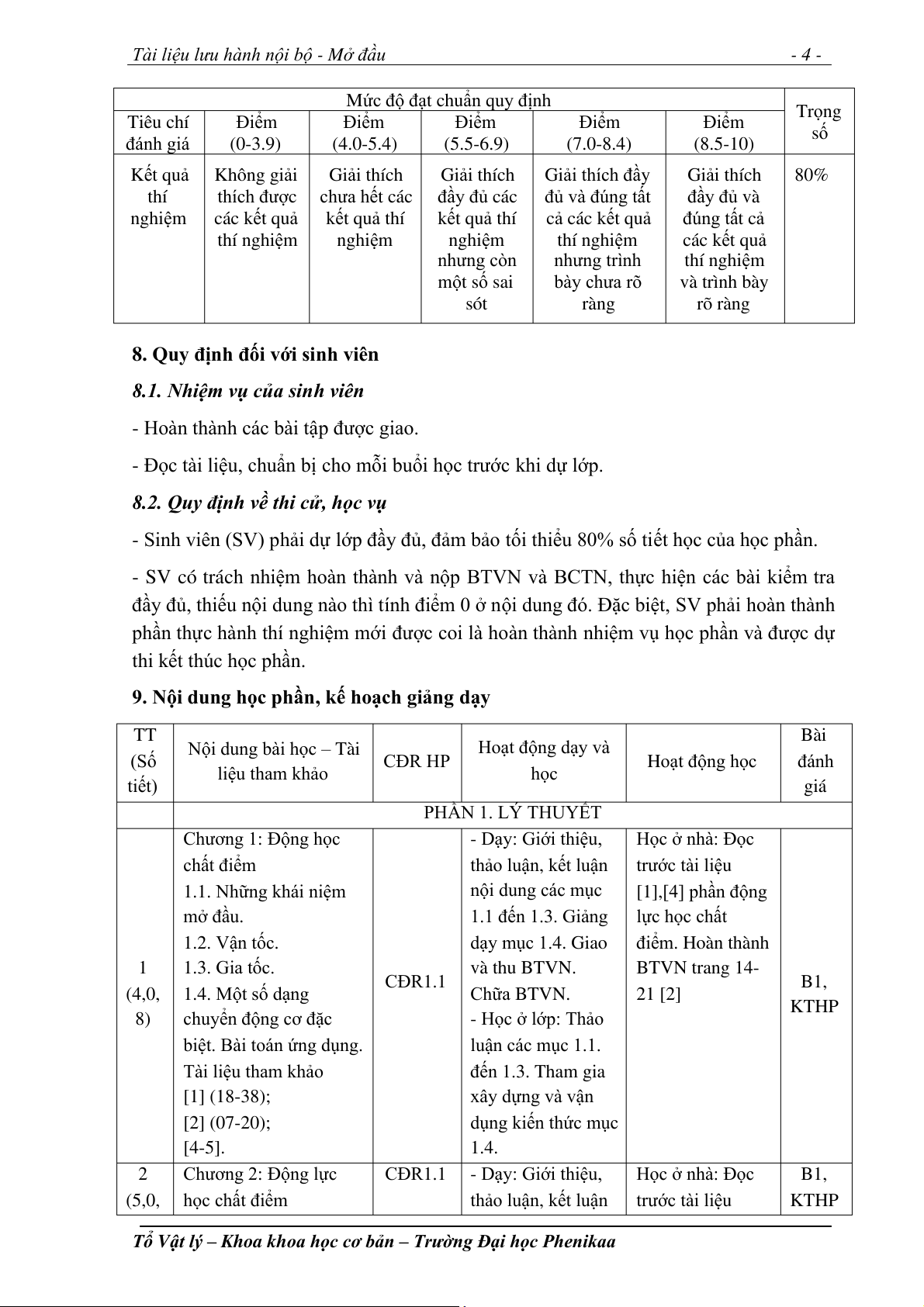 Nội dung bài học – Tài Hoạt động dạy và (Số Hoạt động học đánh liệu tham khảo CĐR HP học tiết) giá PHẦN 1. LÝ THUYẾT Chương 1: Động học - Dạy: Giới thiệu, Học ở nhà: Đọc chất điểm thảo luận kết luận , trước tài liệu 1.1. Những khái niệm nội dung các mục [1],[4] phần động mở đầu. 1.1 đến 1. . Giảng 3 lực học chất 1.2. Vận tốc. dạy mục 1.4. Giao điểm. Hoàn thành 1 1.3. Gia tốc. và thu BTVN. BTVN trang 14- B1, (4,0, 1.4 CĐR1.1 . Một số dạng 21 [2] Chữa BTVN. KTHP 8) chuyển động cơ đặc - Học ở lớp: Thảo