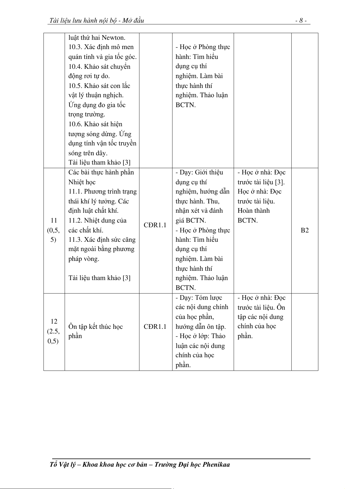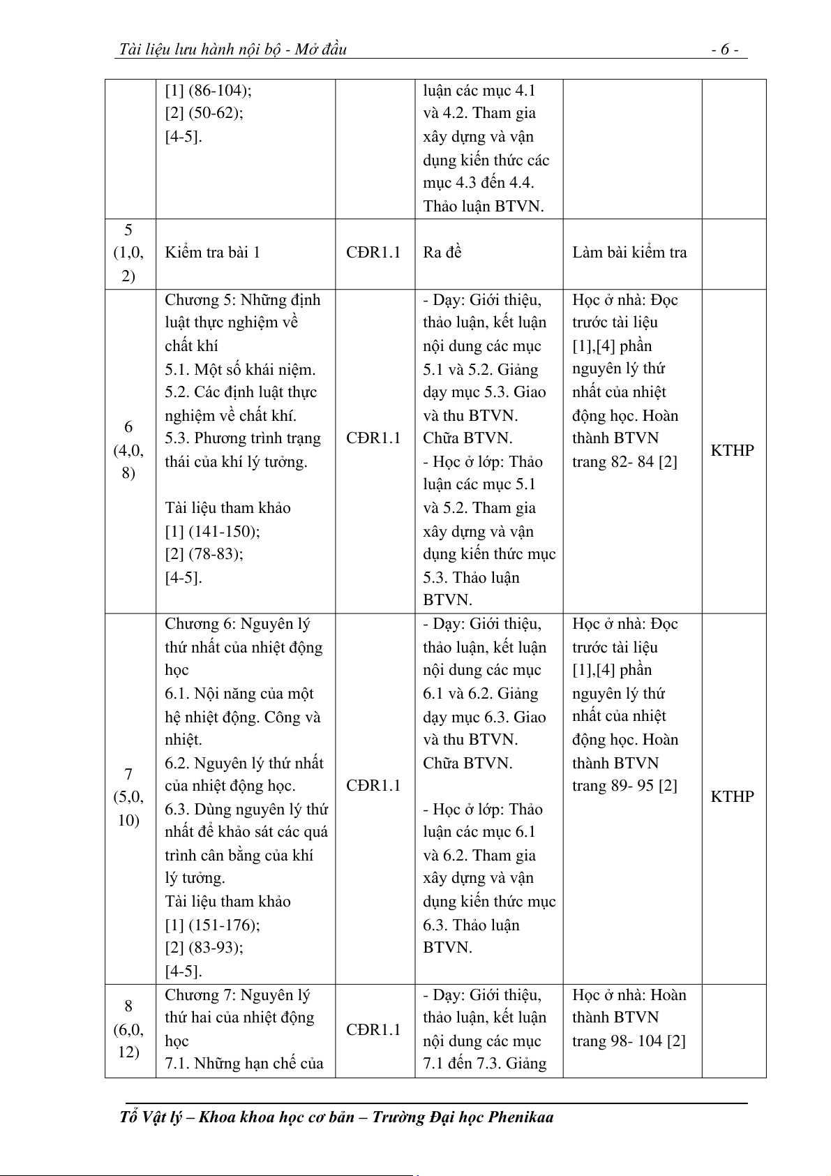 Tài liệu lưu hành nội bộ - Mở đầu - 6 - [1] (86-104); luận các mục 4.1 [2] (50-62); và 4.2. Tham gia [4-5]. xây dựng và vận dụng kiến thức các mục 3 đến 4.4 4. . Thảo luận BTVN. 5 (1,0, Kiểm tra bài 1 CĐR1.1 Ra đề Làm bài kiểm tra 2) Chương 5: Những định - Dạy: Giới thiệu, Học ở nhà: Đọc luật thực nghiệm về thảo luận kết luận , trước tài liệu chất khí nội dung các mục [1],[4] phần 5.1. . Một số khái niệm 5.1 và 5.2. Giảng nguyên lý thứ