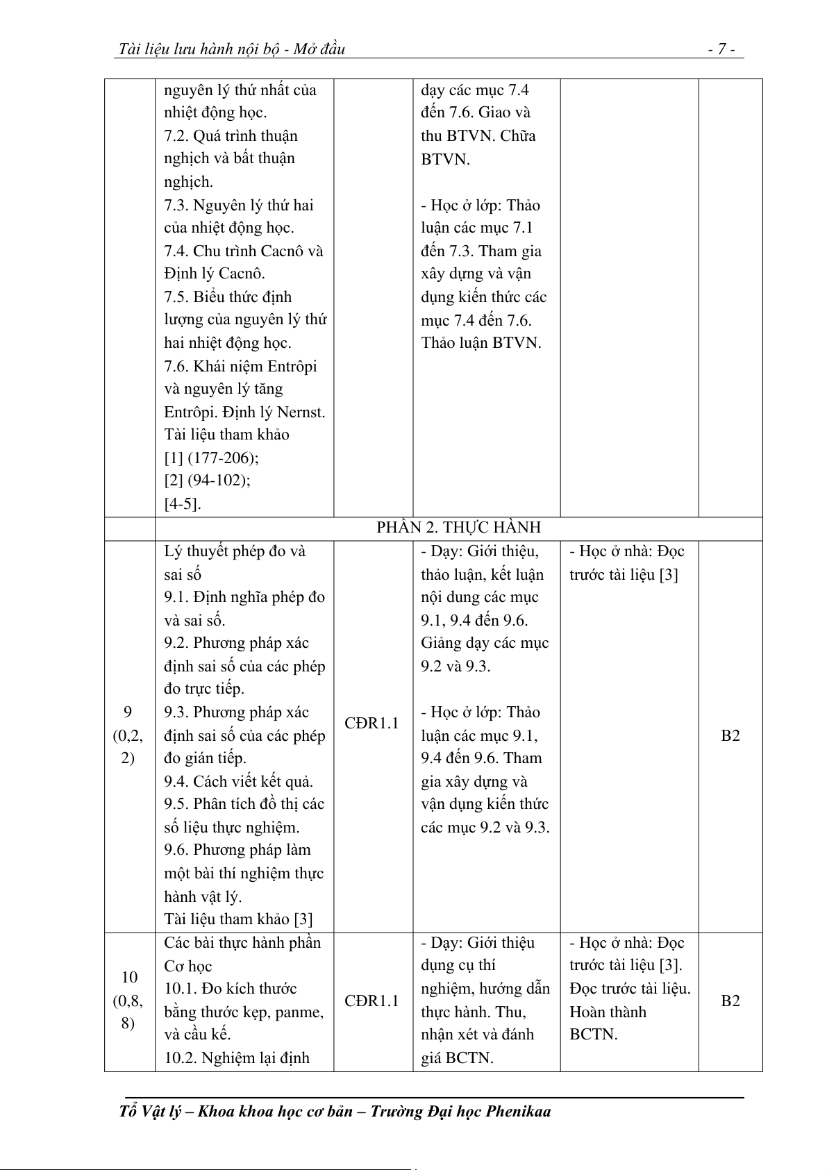 lượng của nguyên lý thứ mục 7.4 đến 7.6. hai nhiệt động học. Thảo luận BTVN. 7.6. Khái niệm Entrôpi và nguyên lý tăng Entrôpi. Định lý Nernst. Tài liệu tham khảo [1] (177-206); [2] (94-102); [4-5]. PHẦN 2. THỰC HÀNH Lý thuyết phép đo và - Dạy: Giới thiệu, - Học ở nhà: Đọc sai số thảo luận kết luận , trước tài liệu [3] 9.1. Định nghĩa phép đo nội dung các mục và sai số. 9.1, 9.4 đến 9.6. 9.2. Phương pháp xác Giả ạ ng d y các mục